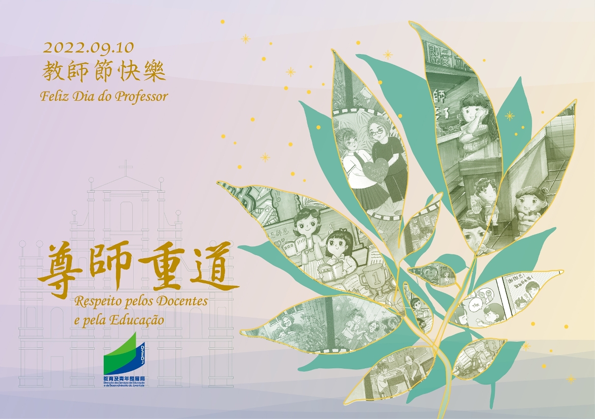 今年,教青局遵循環保節約原則,繼續向全澳教學人員贈送簡約的教師節紀念郵品,並於9月10日在“教菁社區”和“動感教菁”Facebook專頁以短片方式介紹2022教師節紀念郵品和各項系列活動。此外,亦設立了教師節專題網頁(https://portal.dsedj.gov.mo/webdsejspace/site/tday/)和製作了一系列慶祝教師節活動的短片,讓市民向教師們送上祝福和鼓勵,並弘揚尊師重道的精神。同時,9月5日至10月20日向全澳中小學校進行“2022教師節海報及漫畫作品展──作品徵集”活動,讓學生發揮創意,展現感謝老師之情。