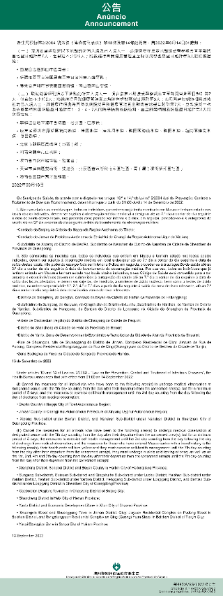 新型冠狀病毒感染應變協調中心(下稱應變協調中心)宣佈,因應內地的疫情變化,衛生局根據第2/2004號法律《傳染病防治法》第10條和第14條的規定,自2022年9月14日凌晨1時起,新增或取消對曾到內地相關區域人士的防疫措施:
