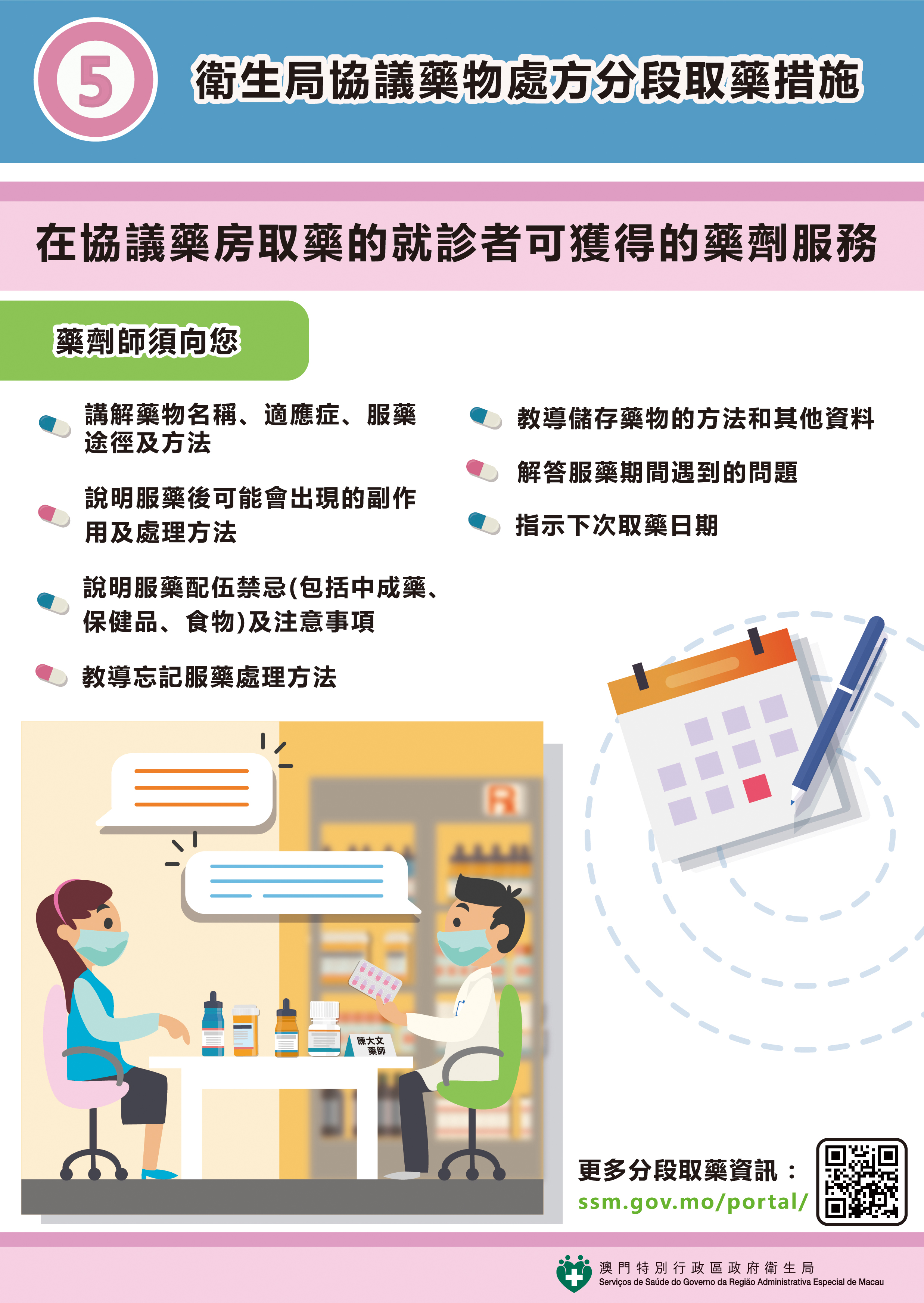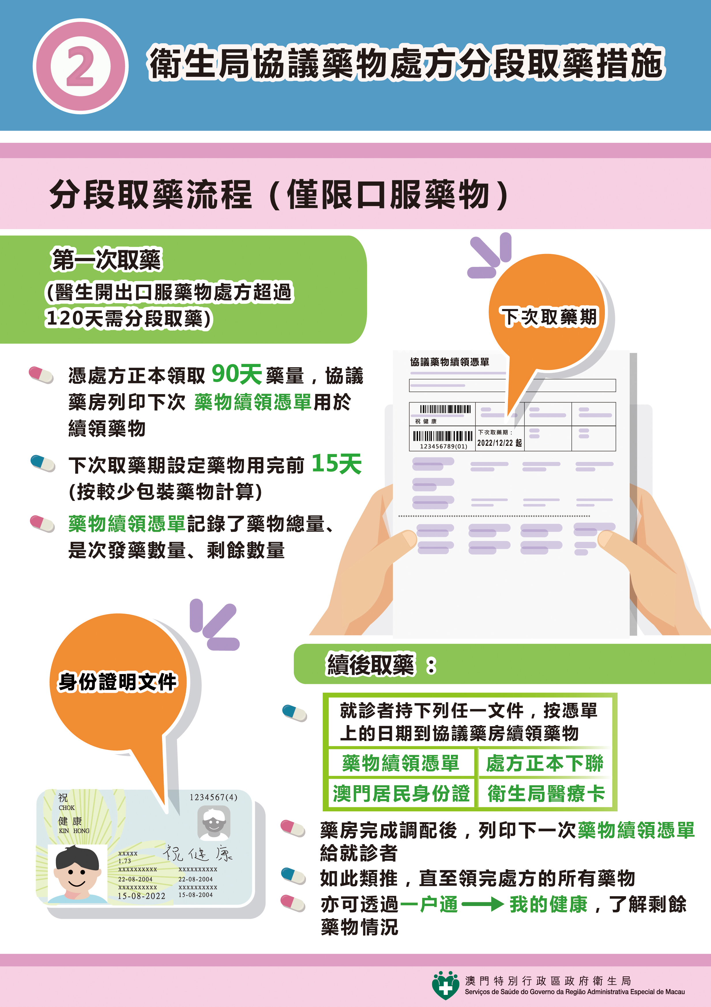 衛生局表示,居民亦可透過“協議藥物處方分段取藥措施"資訊專頁 (網址:https://www.ssm.gov.mo/apps1/StagedMedicineSupply/ch.aspx ) 查閱有關的圖文包及宣傳短片,了解更多關於分段取藥措施的詳情。