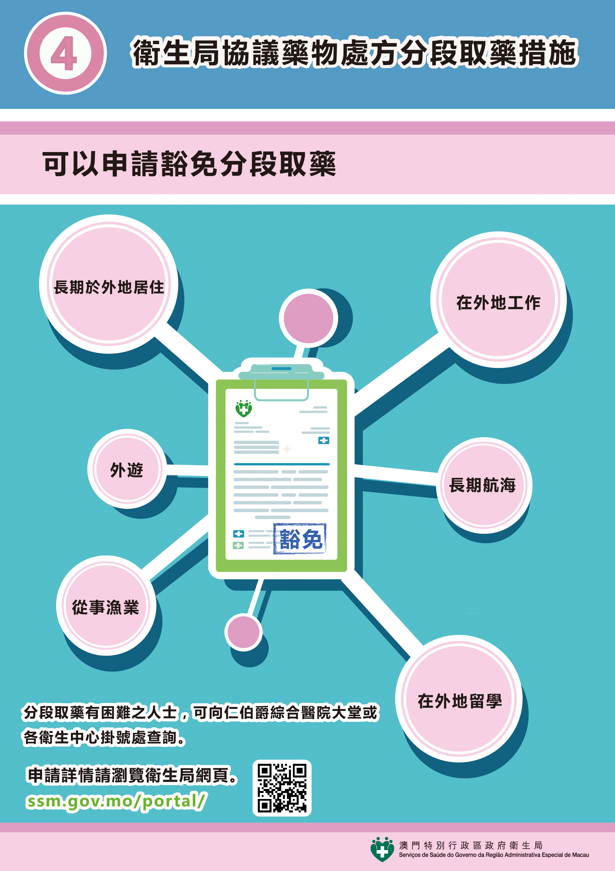 協議藥物處方分段取藥措施明(16)日起正式實施, 目的是讓就診者對藥物治療有更深入了解,推動安全用藥,減少藥物囤積家中造成浪費;加強藥劑師與就診者之間的接觸和溝通,及早發現就診者的服藥問題,以便適時介入,提高藥物治療效果,從而提升藥劑專業服務。衛生局再次提醒就診者留意該項措施內容,具體如下:
