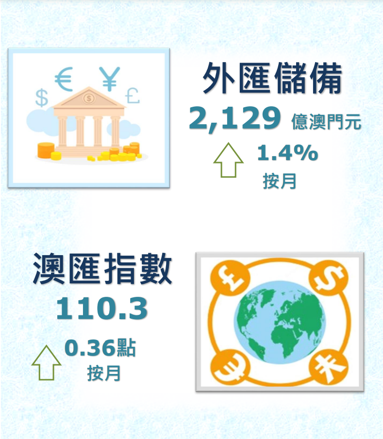 澳門金融管理局今日公佈,2022年8月底澳門特別行政區的外匯儲備資產總額,初步統計為2,129億澳門元(263.4億美元),較2022年7月經修訂總額2,100億澳門元(259.7億美元),上升了1.4%。2022年8月底的外匯資產總額,約相當於2022年7月底澳門流通貨幣的10倍或廣義貨幣供應(M2)中屬於澳門元部份的85.6%。