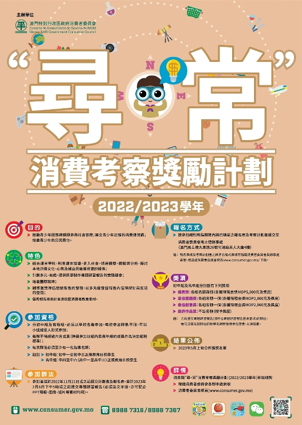 第8屆“尋・常”計劃(2022/2023學年)開始接受報名,有興趣參加的學校及師生可登入消委會網頁(www.consumer.gov.mo)查閱參加細則,下載報名表及計劃書,填妥後於2022年11月21日或之前遞交消委會。