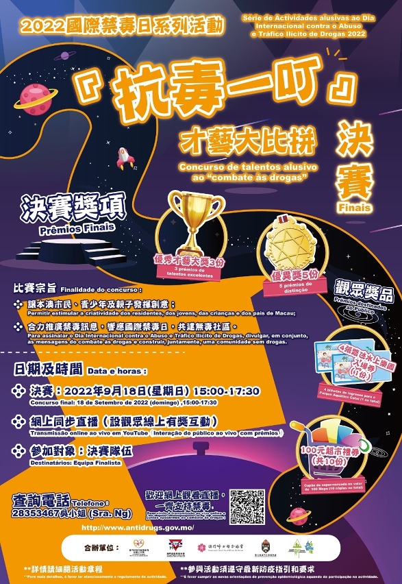 由社會工作局與澳門基督教青年會、聖公會澳門社會服務處、鮑思高青年服務網絡,以及澳門婦女聯合總會合辦的2022國際禁毒日系列活動 “抗毒一叮”才藝大比拼決賽,將於9月18日下午三時在澳門婦聯樂融家庭綜合服務中心禮堂舉行。為配合疫情防控工作,比賽將於專頁直播,並設有網上抽奬活動,歡迎市民踴躍收看。