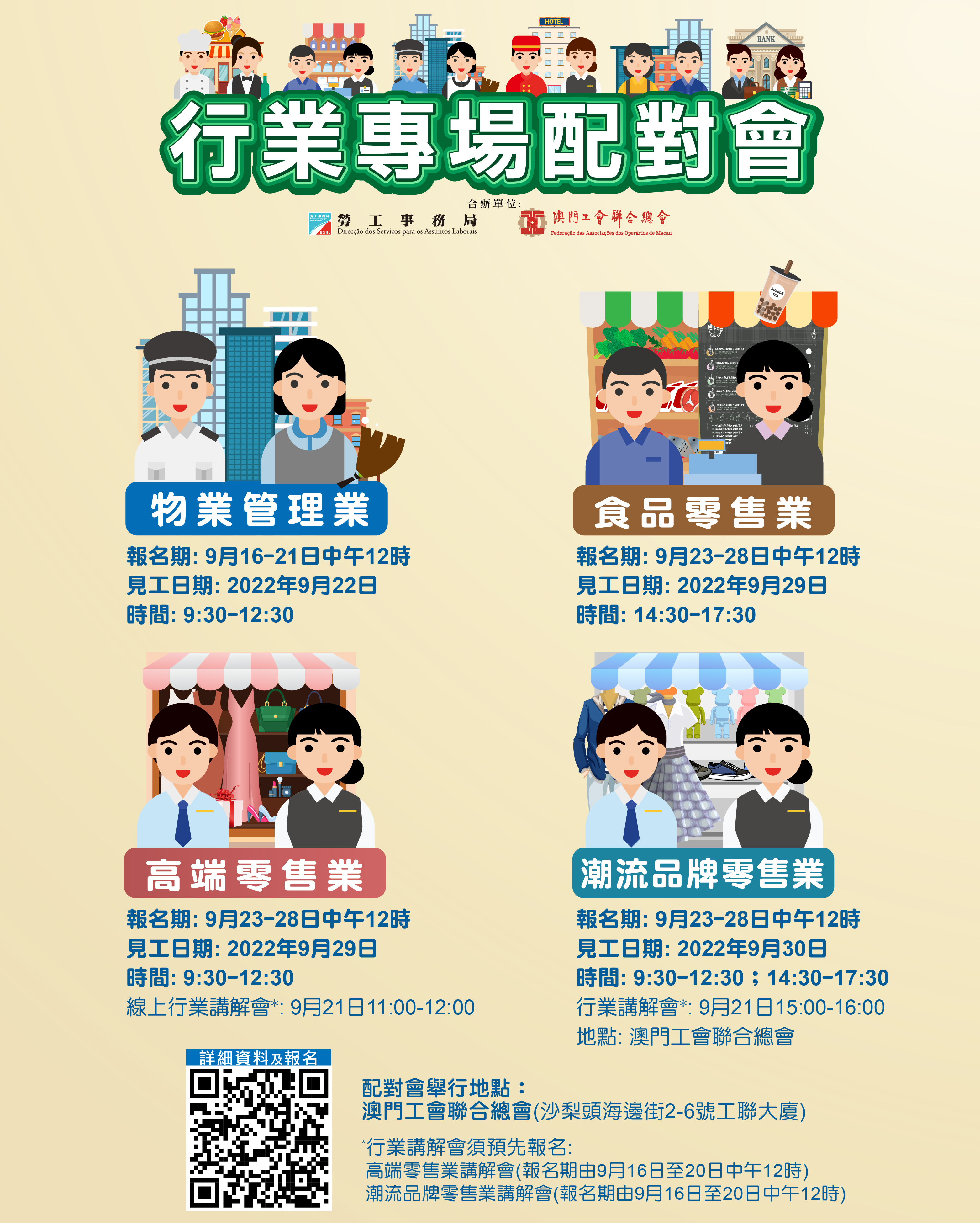 配對會在澳門工會聯合總會(沙梨頭海邊街2-6號工聯大廈)舉行。其中物業管理業配對會報名期由16日起至21日中午12時。另外三場配對會報名期由23日至28日中午12時。活動名額有限,額滿即止。