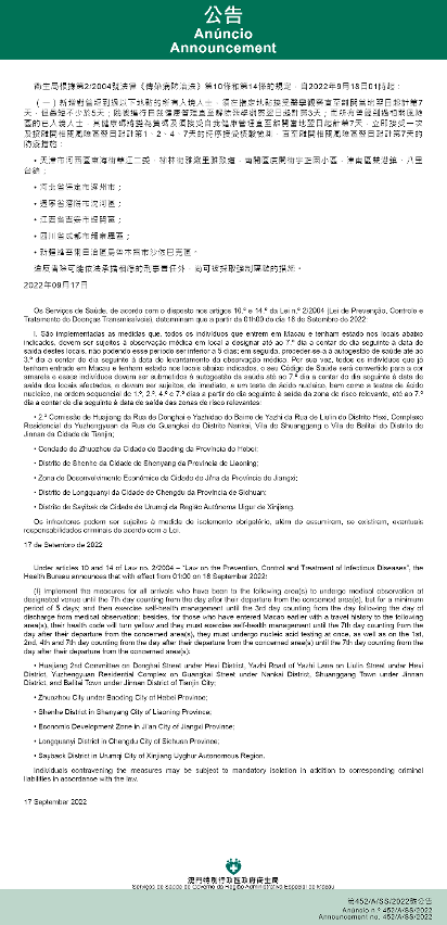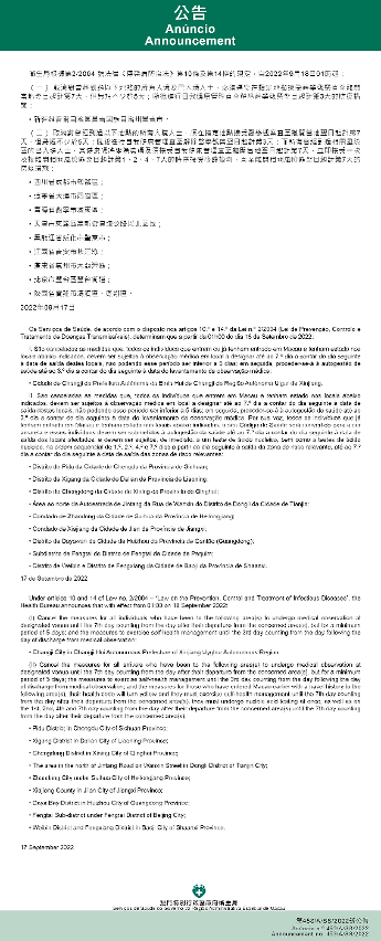 新型冠狀病毒感染應變協調中心(下稱應變協調中心)宣佈,因應內地的疫情變化,衛生局根據第2/2004號法律《傳染病防治法》第10條和第14條的規定,自2022年9月18日凌晨1時起,新增或取消對曾到內地相關區域人士的防疫措施: