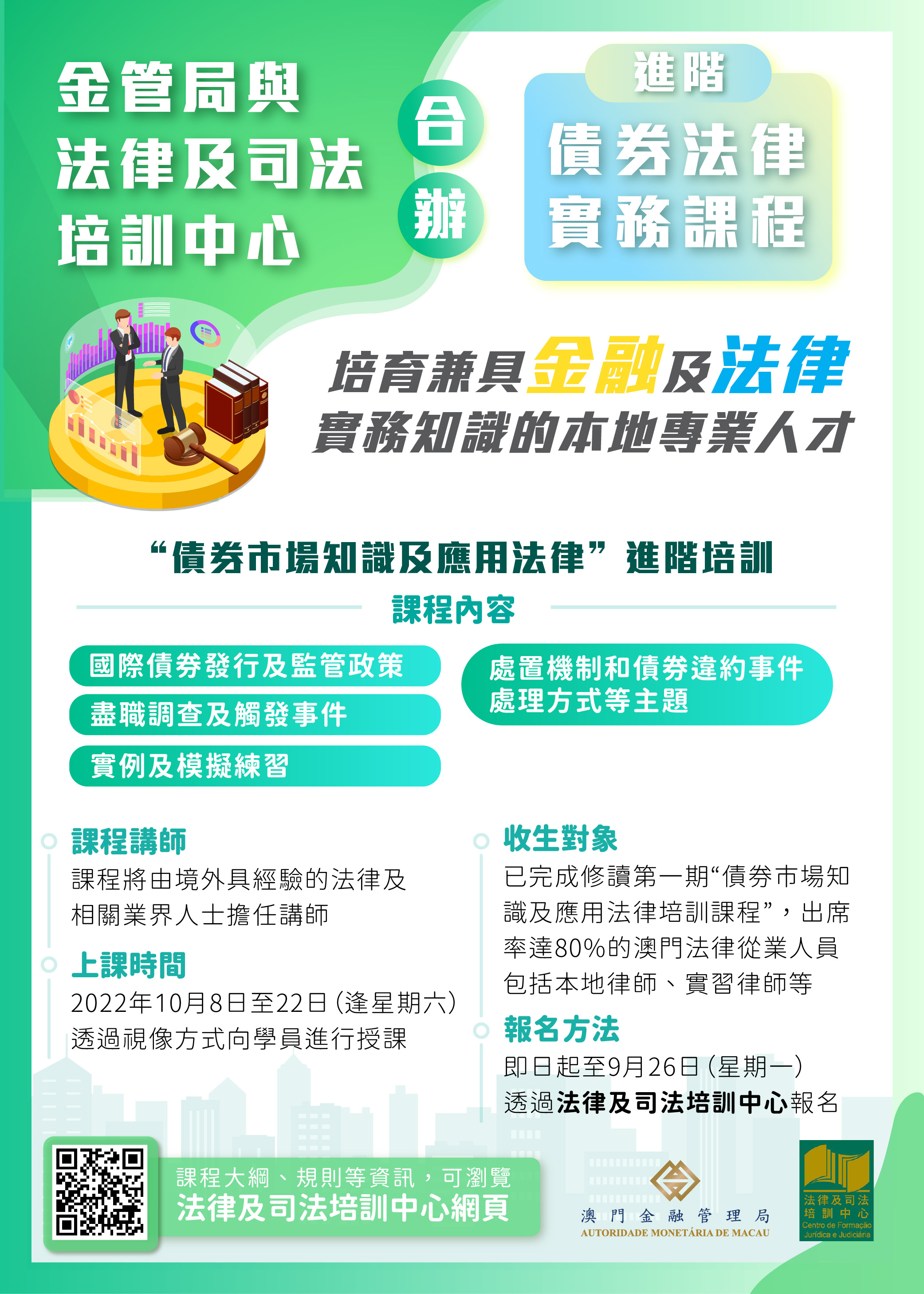 為培育更多兼具金融及法律實務知識的本地專業人才,澳門金融管理局與特區政府法律及司法培訓中心再度合作,舉辦面向澳門法律從業人員的“債券市場知識及應用法律”進階培訓課程,並由今(19)日起接受報名。