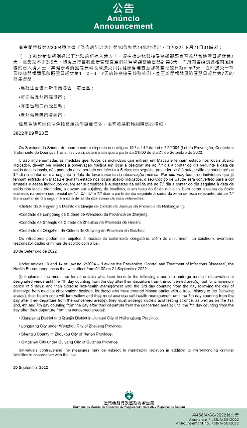 新型冠狀病毒感染應變協調中心(下稱應變協調中心)宣佈,因應內地的疫情變化,衛生局根據第2/2004號法律《傳染病防治法》第10條和第14條的規定,自2022年9月21日凌晨1時起,新增或取消對曾到內地相關區域人士的防疫措施: