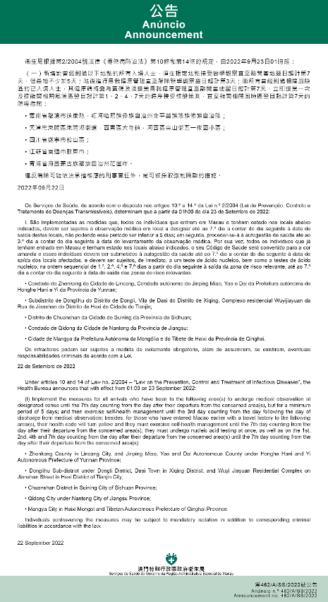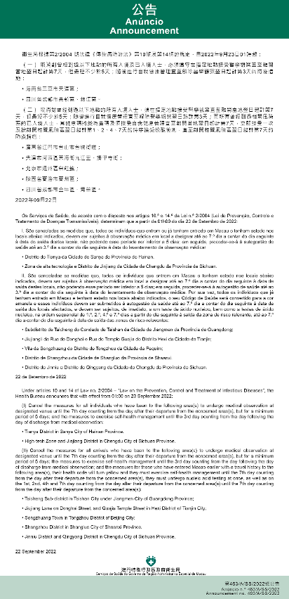 新型冠狀病毒感染應變協調中心(下稱應變協調中心)宣佈,因應內地的疫情變化,衛生局根據第2/2004號法律《傳染病防治法》第10條和第14條的規定,自2022年9月23日凌晨1時起,新增或取消對曾到內地相關區域人士的防疫措施: