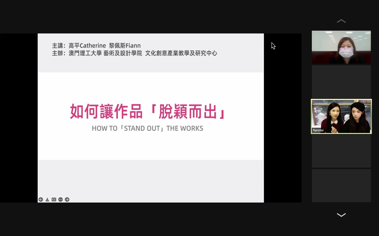 為擴闊學生的藝術視野,澳門理工大學藝術及設計學院文化創意產業教學及研究中心經常邀請藝術家及設計師,與學生分享創作和設計經驗,提升學生的藝術水平。中心早前舉辦“如何讓作品脫穎而出”線上講座,邀請亞洲殘運會會徽主設計者及跨界藝術家高平和黎佩斯,分享其設計理念和實踐經歷,吸引師生踴躍參與。