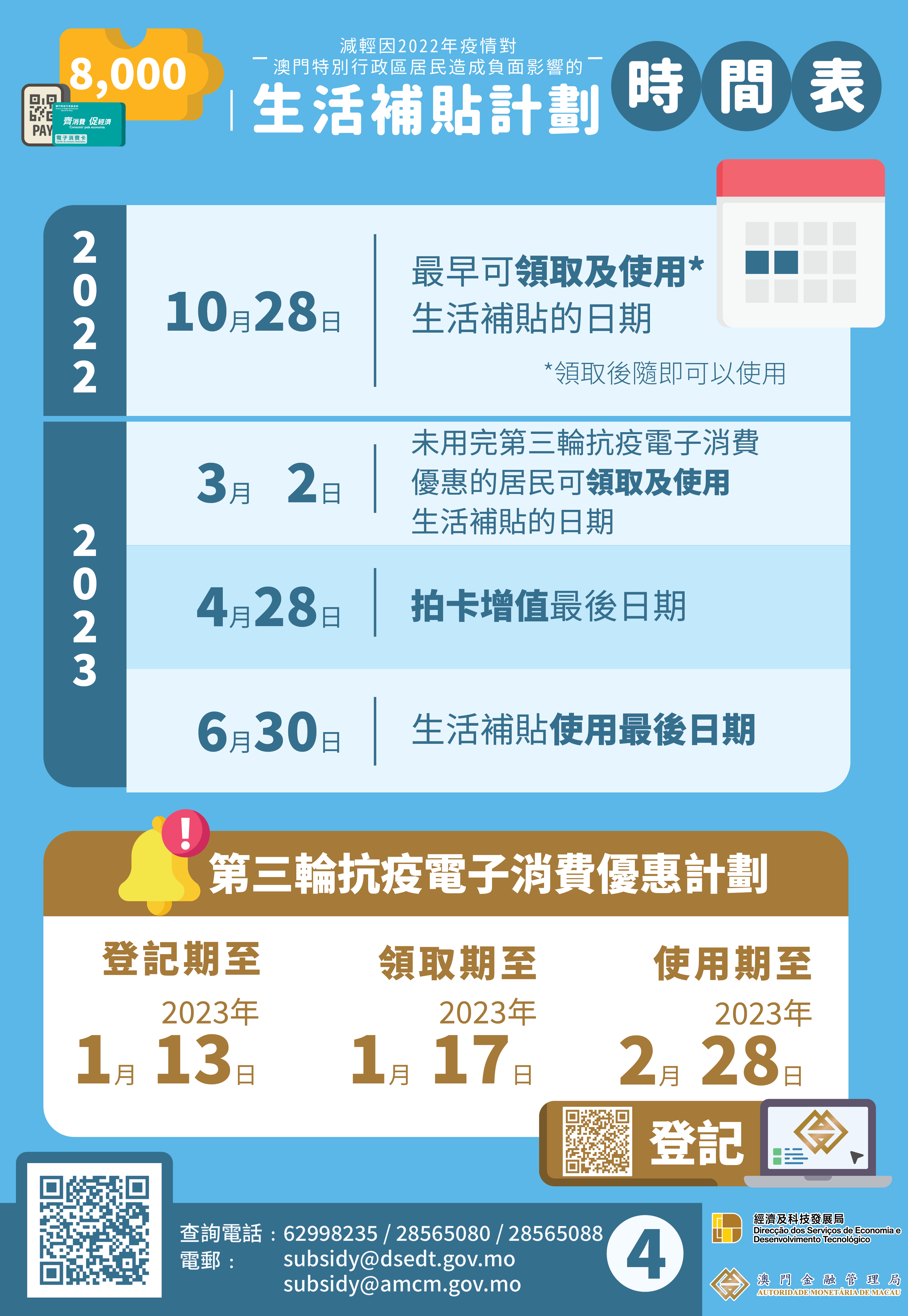 還需要注意的是,獲取第三輪抗疫電子消費優惠是領取生活補貼的必須條件。因此,再次提醒居民,如從未登記電消優惠,需於2023年1月13日前登記並成功領取,方具資格領取生活補貼。