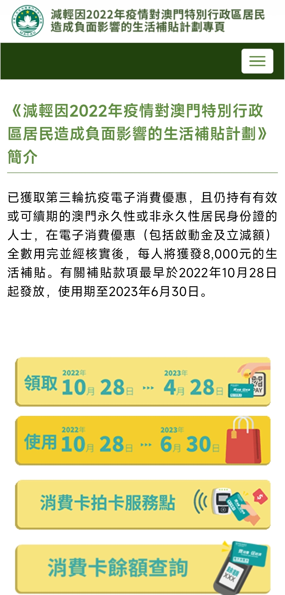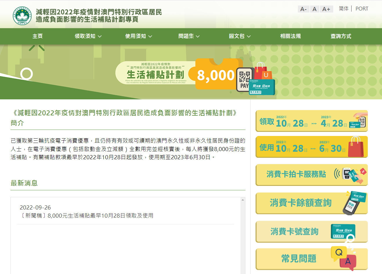 根據昨(26)日公佈於《澳門特別行政區公報》的第44/2022號行政法規《減輕因2022年疫情對澳門特別行政區居民造成負面影響的生活補貼計劃》(下稱“生活補貼計劃”)及第185/2022號行政長官批示,合資格的澳門居民最早可於10月28日領取及使用8,000元(澳門元,下同)的生活補貼。