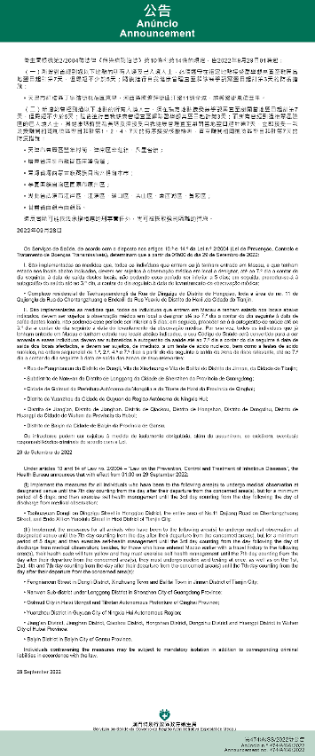 新型冠狀病毒感染應變協調中心(下稱應變協調中心)宣佈,因應內地的疫情變化,衛生局根據第2/2004號法律《傳染病防治法》第10條和第14條的規定,自2022年9月29日凌晨1時起,新增或取消對曾到內地相關區域人士的防疫措施: