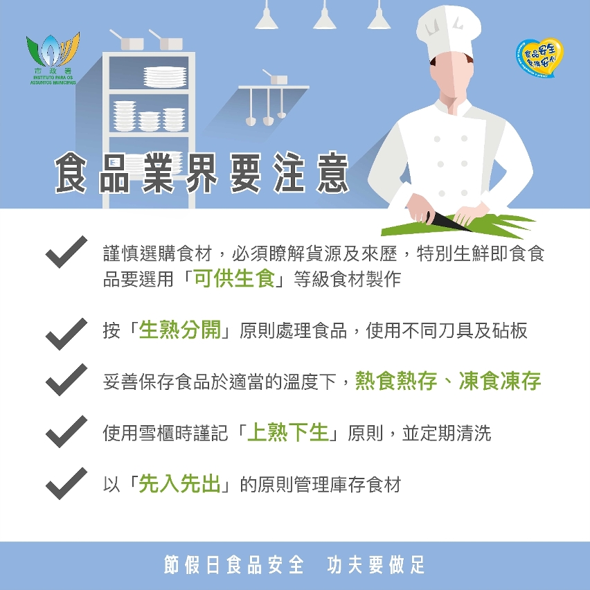 同時,提醒食品業界,必須嚴格按照《食品安全法》及各項食品安全衛生指引,做好食品採購、製作、展示及售賣的食安操作,避免交叉污染。向商譽良好及衛生可靠的供應商採購食材,瞭解貨源及來歷,特別是刺身等生鮮即食食品必須選用「可供生食」級別食材製作;食品製作須嚴按「生熟分開」原則,使用不同刀具及砧板分開處理生熟食材,尤其生鮮即食食品應在獨立區間處理;做好冷熱食品的貯存,有需要展示的食品,凍食冷藏食品必須放在冷藏展示櫃中,刺身等生鮮食品不能在室溫下展示,熱食不能室溫下存放超過兩小時;預制海鮮、肉類食品在供應或食用前必須徹底翻熱;此外,須按「先入先出」原則使用雪櫃,並定期清洗及檢查雪櫃,確保內冷空氣有效循環。