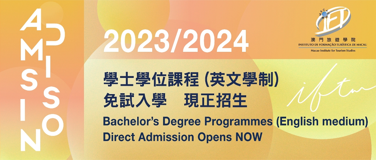 澳門旅遊學院一直致力培育旅遊服務行業專業人才,提供全方位學士、碩士及博士學位課程及專業培訓課程。學士學位課程(英文學制)現正接受學業成績良好、持有公開試成績、獲高中校長推薦或符合其他入學資格的本地考生透過“面試”或“免試入學”途徑報考,報名期至12月16日,合資格新生可獲獎學金。請瀏覽招生網頁 https://www.iftm.edu.mo/admission 或掃描二維碼了解詳情。