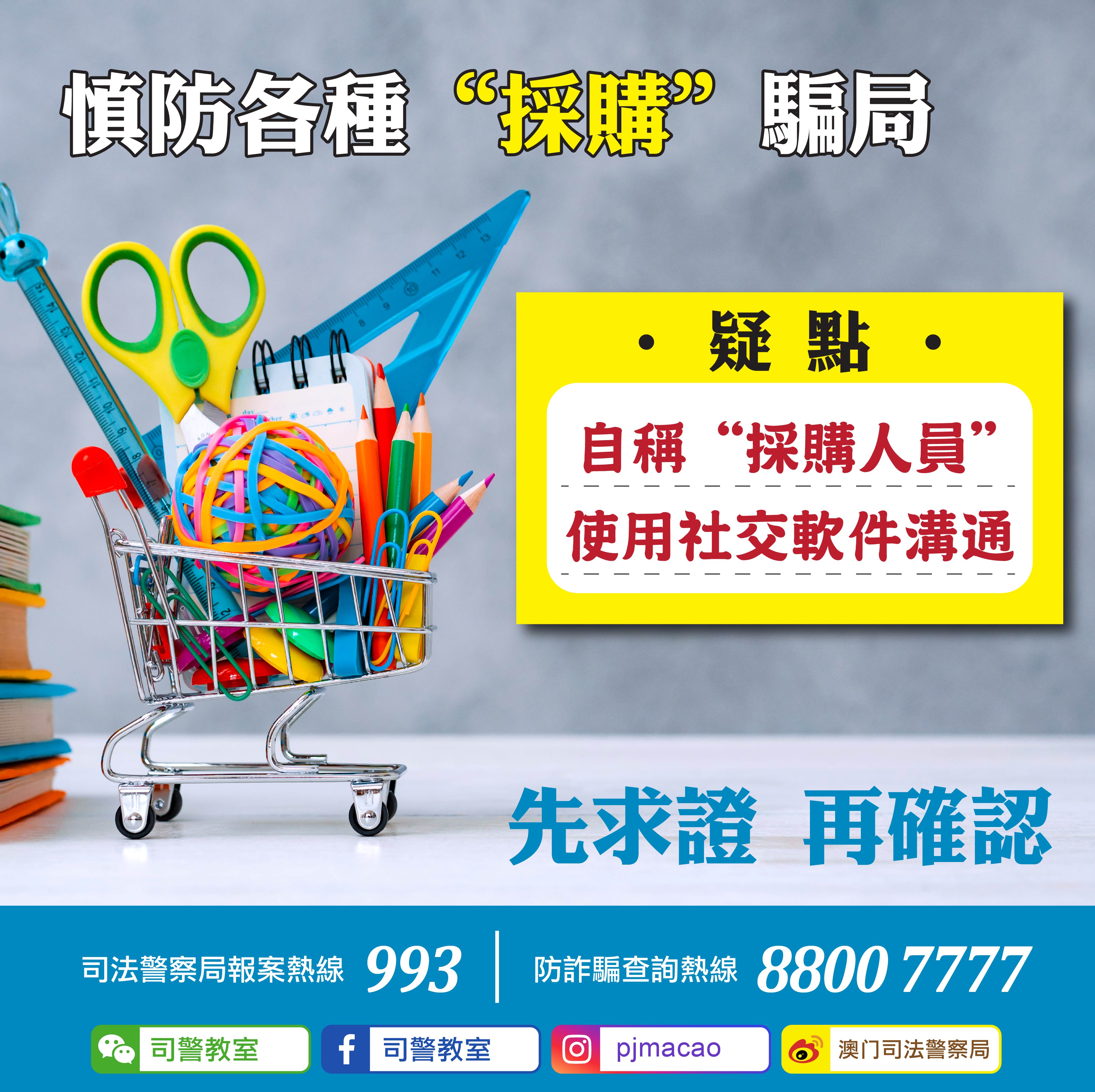 近日,司法警察局接獲兩宗訛稱訂購貨品的詐騙案。其中一宗的騙徒假冒高等院校職員,致電事主聲稱訂購外賣飯盒,付清貨款後,騙徒再透過手機通訊軟件聯絡事主,要求事主向其指定的“供應商”訂購“佛跳牆”,隨後傳來一張載有銀行轉帳記錄的相片以示已預付貨款;事主不虞有詐,遂代其向“供應商”支付訂金訂購,後發現並無收到轉帳款項,且與騙徒失聯,方知被騙。