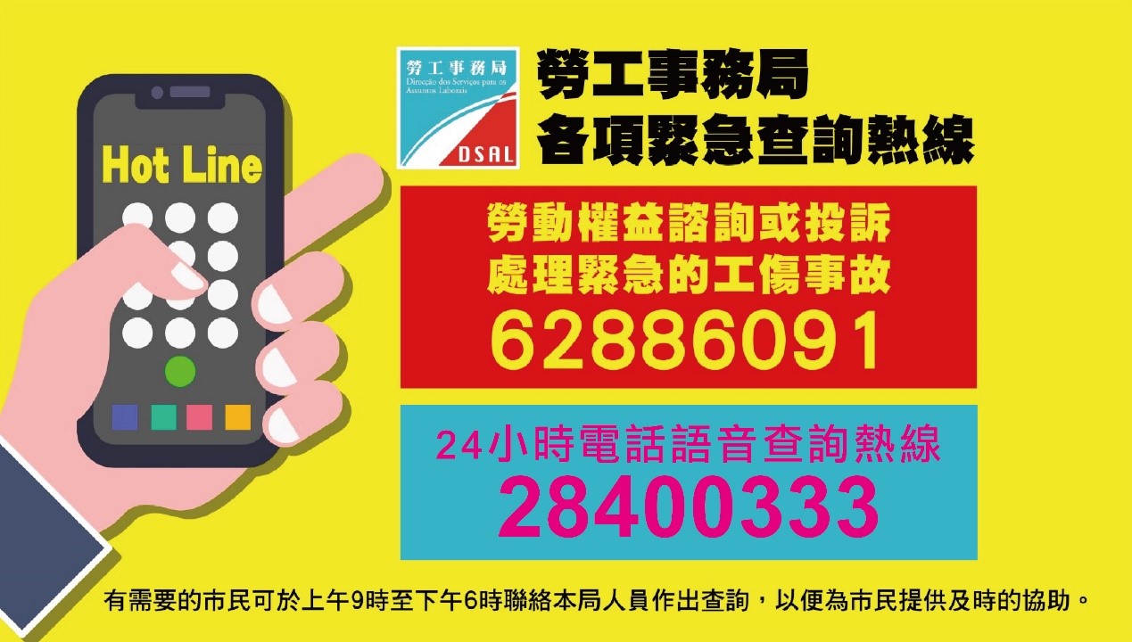 為了協助市民處理緊急的勞資糾紛或工傷事故,勞工事務局將在以下節假日期間(2022年10月1日至5日),特設緊急熱線電話62886091,有需要的市民可於該段期間的上午9時至下午6時,聯絡勞工局人員作出查詢,以便為市民提供適切的協助。