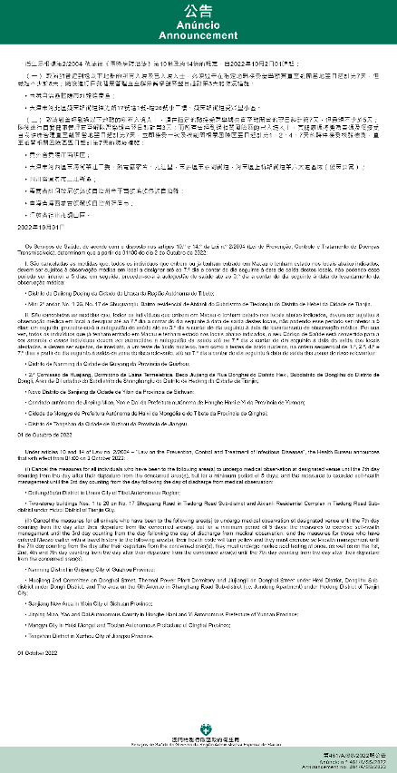 新型冠狀病毒感染應變協調中心(下稱應變協調中心)宣佈,因應內地的疫情變化,衛生局根據第2/2004號法律《傳染病防治法》第10條和第14條的規定,自2022年10月2日凌晨1時起,新增或取消對曾到內地相關區域人士的防疫措施: