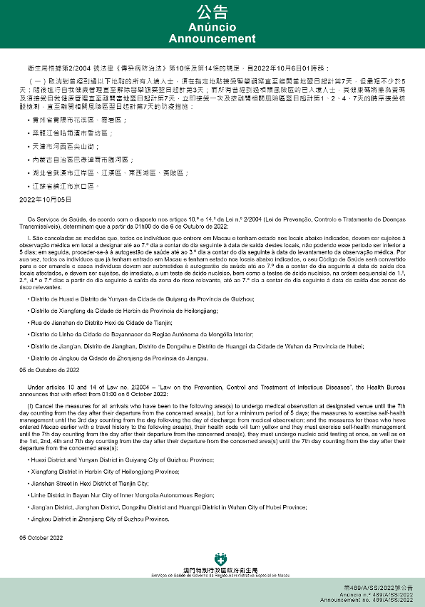 新型冠狀病毒感染應變協調中心(下稱應變協調中心)宣佈,因應內地的疫情變化,衛生局根據第2/2004號法律《傳染病防治法》第10條和第14條的規定,自2022年10月6日凌晨1時起,新增或取消對曾到內地相關區域人士的防疫措施:
