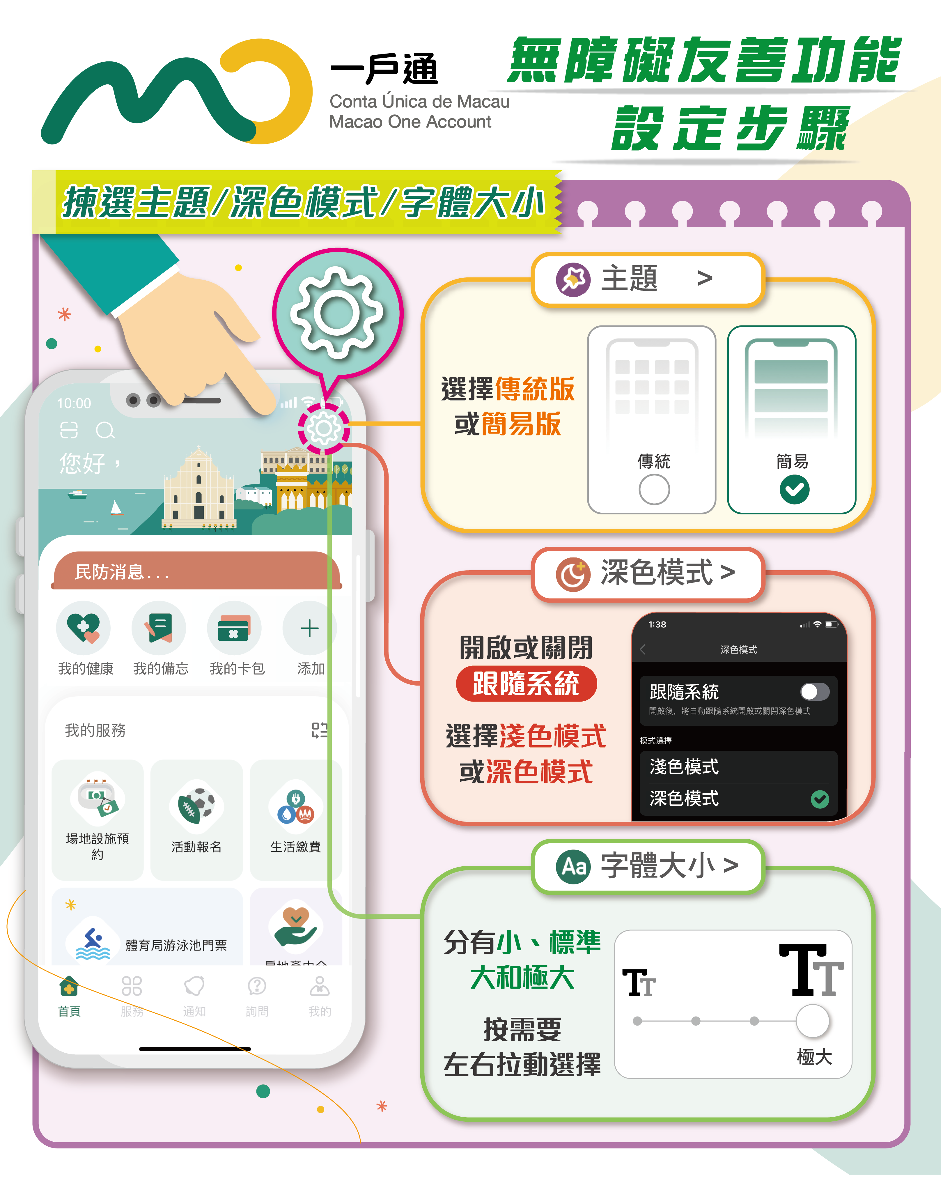 吳惠嫻副局長介紹時指出,經聽取社會各界的意見和建議,“一戶通”持續完善無障礙友善功能。其中,經優化的“一戶通”簡易版具有傳統版大部分常用功能,以簡易操作為原則,充分照顧長者的使用需要。例如,簡易版可自由調節字體、圖標至“極大”,達到易操作性、易讀性;圖標亦採用擬物化、通用化的設計,讓長者使用時能夠快速理解。另外,首頁已羅列多項常用服務,例如“我的健康”、“在生證明”等,方便長者更直觀和清晰地找到所需服務。