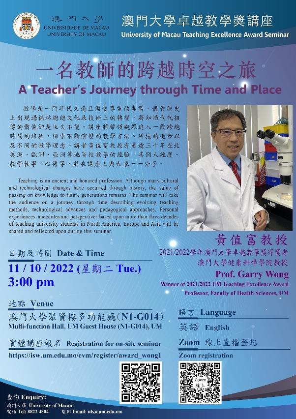 澳門大學將於10月11日(星期二)舉行“澳門大學卓越教學獎"講座,邀請了2021/2022學年得獎者、健康科學學院教授黃值富以“一名教師的跨越時空之旅"為題進行主講,探討不斷演變的教學方法和不同的教學理念,以及其個人教學經驗。歡迎有興趣人士參加。