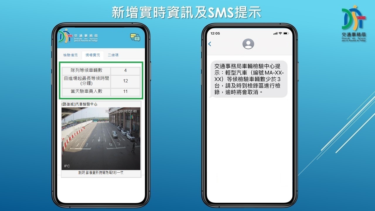 新投入運作的驗車線配備新系統及設備,包括制動及尾氣檢測等設備更新及工序調整等;屆時路氹城汽車檢驗中心亦升級至與摩托車驗車中心相同的實時資訊發佈,即增加“隊列等候車輛數”、“當天驗車員人數”及優化服務顯示屏界面佈局,以及增設手機短訊(SMS)提示,向已報到之送檢人提示輪候情況。送檢人士可透過場內顯示屏或掃瞄報到憑條上的二維碼瞭解相關實時資訊。此外,局方亦製作驗車流程影片(https://youtu.be/KkaCgEZQ3Yc ),方便市民瞭解臨時檢驗安排。
