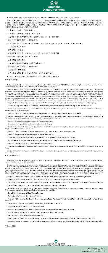 新型冠狀病毒感染應變協調中心(下稱應變協調中心)宣佈,因應內地的疫情變化,衛生局根據第2/2004號法律《傳染病防治法》第10條和第14條的規定,自2022年10月8日凌晨1時起,新增或取消對曾到內地相關區域人士的防疫措施:
