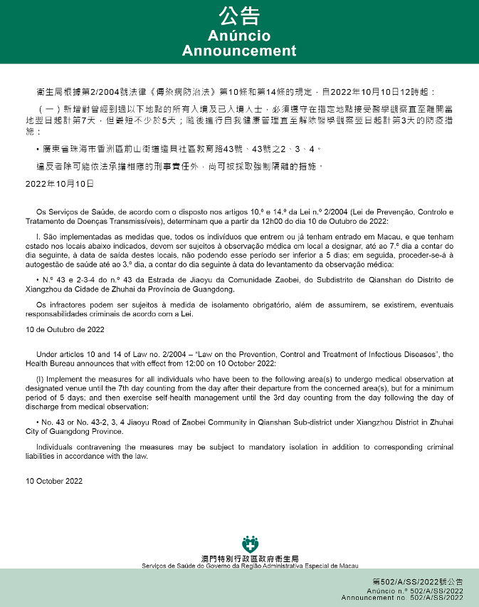 新型冠狀病毒感染應變協調中心(下稱應變協調中心)宣佈,因應內地的疫情變化,衛生局根據第2/2004號法律《傳染病防治法》第10條和第14條的規定,自2022年10月10日中午12時起,新增對曾到廣東省珠海市相關區域人士的防疫措施: