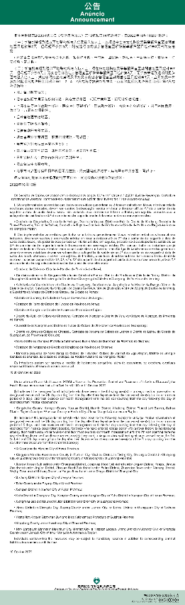 新型冠狀病毒感染應變協調中心(下稱應變協調中心)宣佈,因應內地的疫情變化,衛生局根據第2/2004號法律《傳染病防治法》第10條和第14條的規定,自2022年10月11日凌晨1時起,新增或取消對曾到內地相關區域人士的防疫措施: