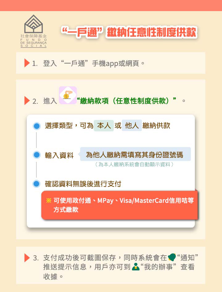 即日起,任意性制度受益人可於供款月內登入“一戶通”手機應用程式或網頁(https://www.mo.gov.mo/home),憑澳門居民身份證編號,使用政付通內的電子支付工具、MPay澳門錢包及信用卡繳納任意性制度供款,方便快捷,亦可透過指定銀行的電子渠道及櫃枱、銀通網絡自動櫃員機、貼有社保供款標籤的自助服務機、市政署轄下市民服務中心及分站,以及社保基金各服務點繳款。