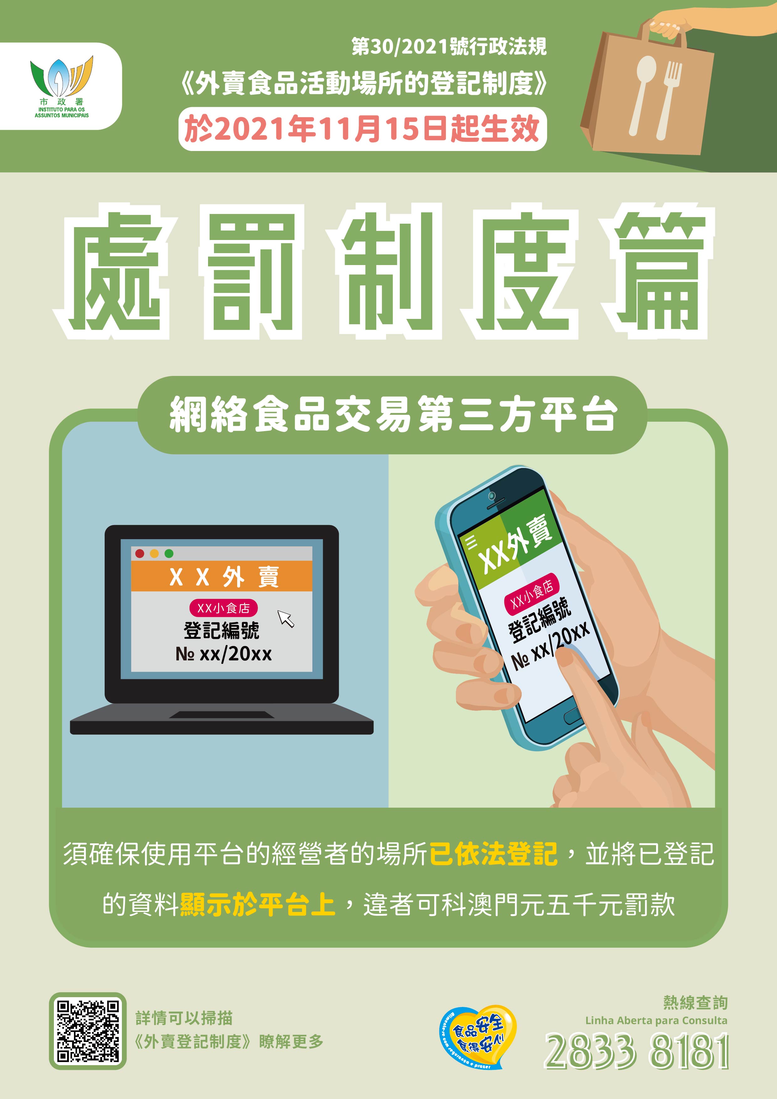 市政署提醒業界,所有外賣店不得設於私人住宅單位等環境與經營外賣食品活動明顯不符的不動產內。此外,外賣店須在開業前完成登記,並在實體店當眼處張貼登記證明。若是透過互聯網或手機應用程式進行經營或推廣,則須於媒介上顯示場所登記編號。同時,外賣食品網絡交易平台業者須確保進駐平台的所有外賣店已完成登記並將其登記編號顯示於平台上,以便消費者查閱及辨識。