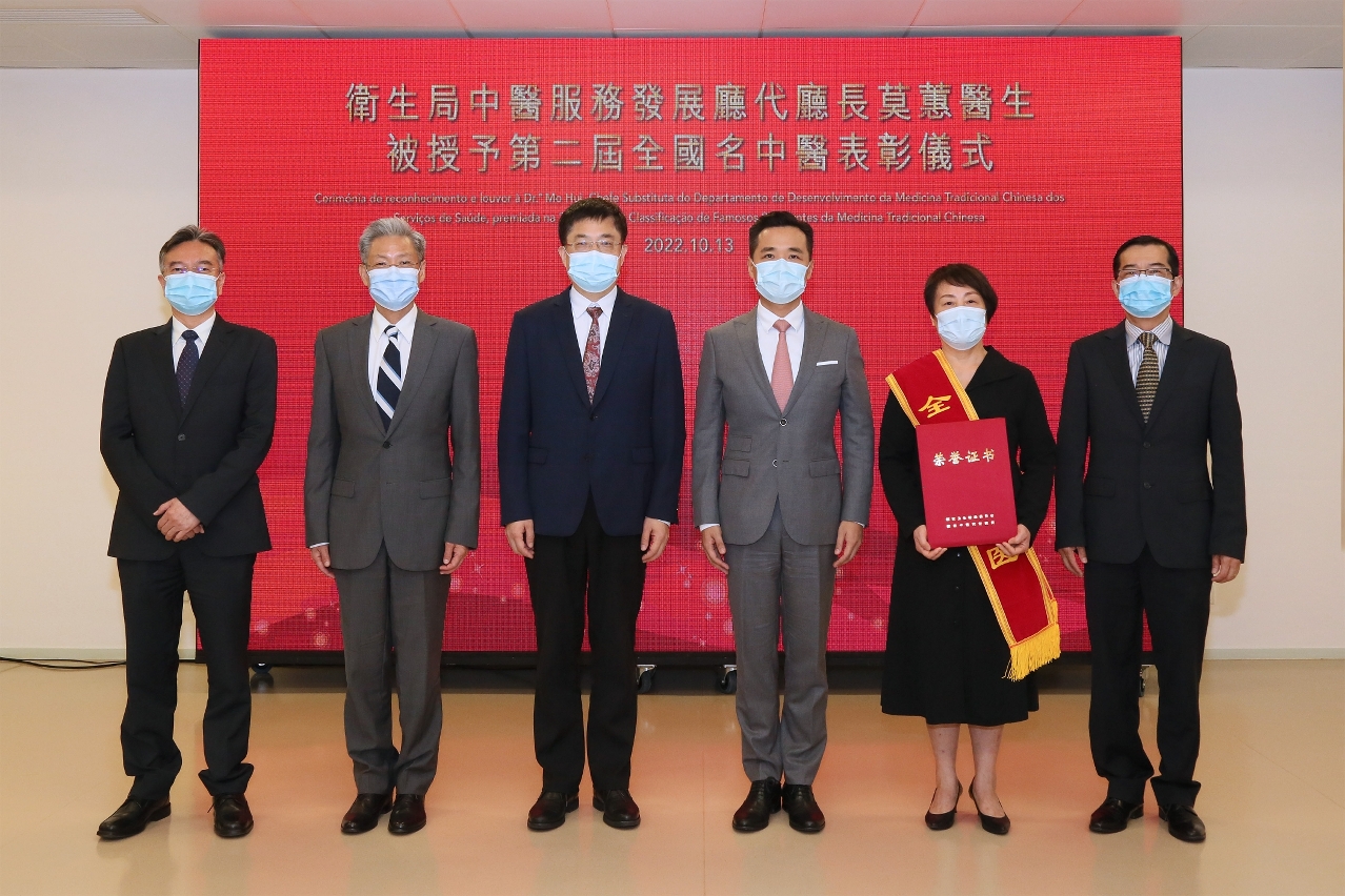 由國家人力資源社會保障部、國家衛生健康委員會和國家中醫藥管理局組織的第2屆全國名中醫評選工作,今年在全國範圍內共評選出101名全國名中醫,港澳地區是首次參與評選,衛生局中醫服務發展廳莫蕙代廳長成為澳門首位獲得此項殊榮的中醫生。莫蕙代廳長被授予第2屆全國名中醫表彰儀式於今(13)日舉行,中央人民政府駐澳門特別行政區聯絡辦公室宣傳文化部萬速成部長,澳門特別行政區政府衛生局羅奕龍局長、郭昌宇副局長、鄭成業副局長、陳永華副局長等出席了表彰儀式。