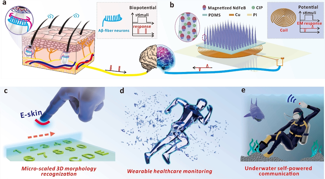 受人體皮膚的啓發,研究團隊設計出由毛髮狀磁化微纖毛陣列(MMCA)和柔性綫圈組成的電子皮膚系統。得益於MMCA内置的對齊磁矩,外界機械刺激所帶來的的微纖毛形變能夠在導電線圈中產生相應的電壓信號,從而實現對外部壓力及表面形貌的反饋。該工作系統研究了電壓強度與壓力的內在聯繫,並探討如何設計MMCA以優化電壓信號的强度和波形來定量反饋表面形貌的三維信息。此外,通過調控MMCA内置的磁矩排列,該電子皮膚亦可在單一器件上輸出多種電壓波形作爲信息編碼,用於高效人機交互和大容量信息傳輸。由於該電子皮膚的工作原理是電磁感應現象,因而能在高溫、水下等不同環境中以自供電的方式實現穩定工作。相關論文綜合展示了該電子皮膚在穿戴式健康檢測(包括呼吸狀態、關節彎曲感知等)、盲文識別與浮雕信息重塑、大容量指令傳輸、水下摩斯密碼通信等多方面的應用優勢。