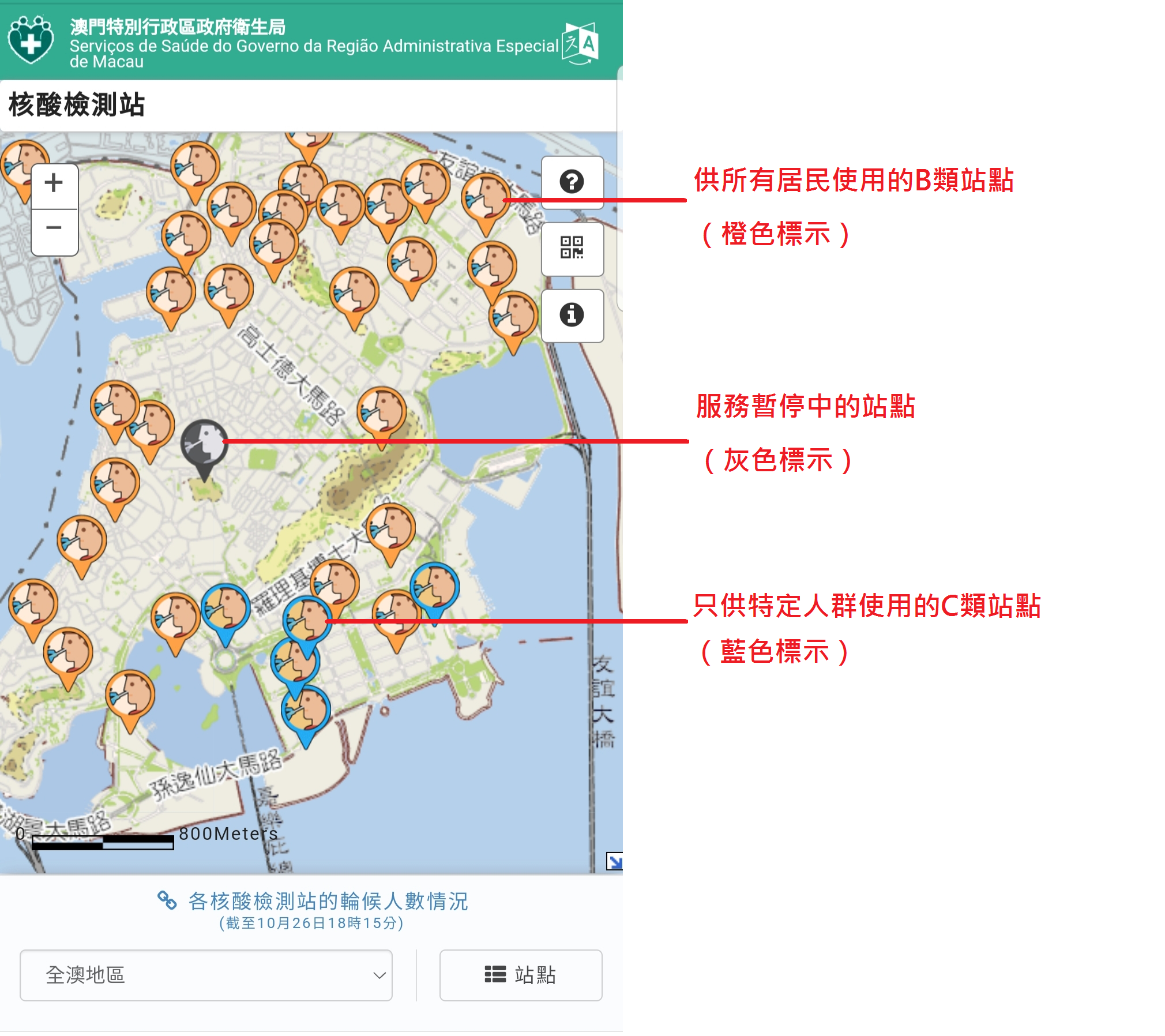 2. 各核酸檢測站於地圖相應位置上以圖示標識,並以不同顏色區分各站點類別(附圖二):