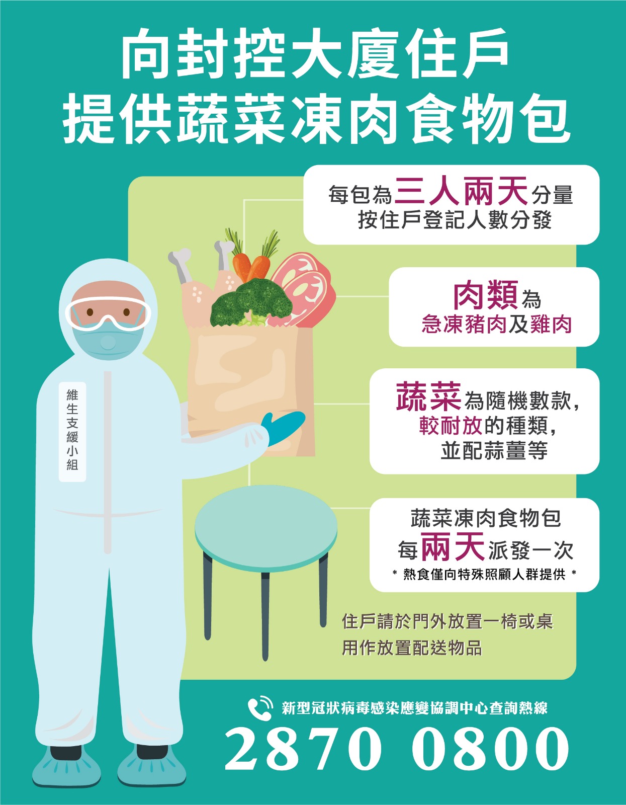 市政署為每戶居民提供應急食物包,明日起將派發蔬菜凍肉食物包,對未具備煮食條件的住戶提供熱食飯盒,以滿足居民基本需要。