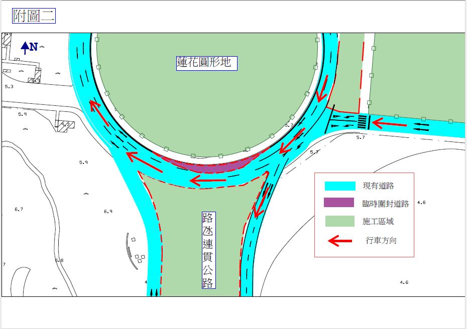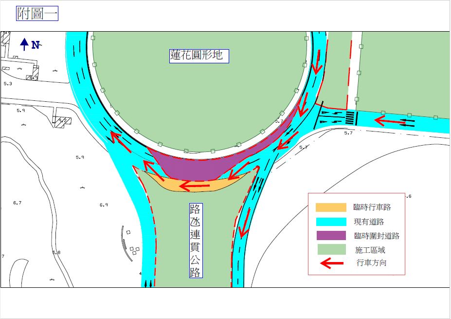 2022年10月29日至2022年11月17日期間,每天晚上8時至翌日早上6時,將局部封閉蓮花圓形地南側的行車線,車輛可使用臨時行車線至蓮花圓形地方向。(請參閱”附圖一”),而在每日早上6時至晚上8時,將臨時重新開放原有的2條行車線予車輛通行。(請參閱”附圖二”)。請駕駛者留意現場交通指示標誌或遵守現場交通警員的指揮及安排。