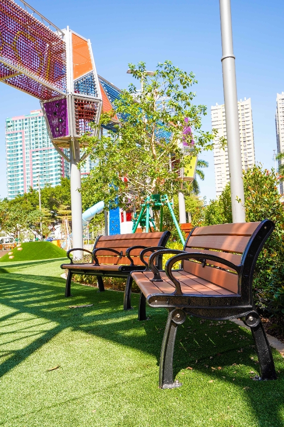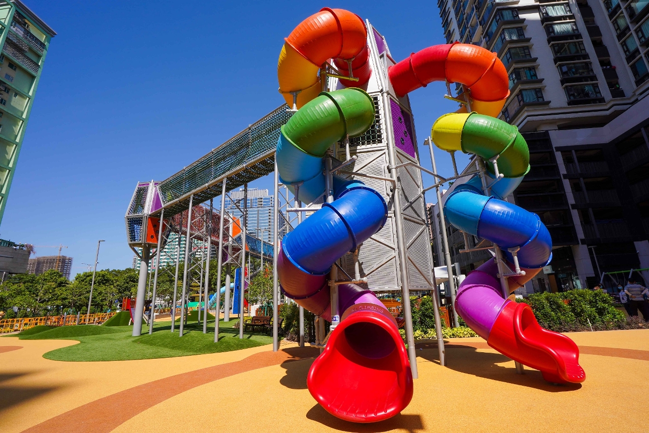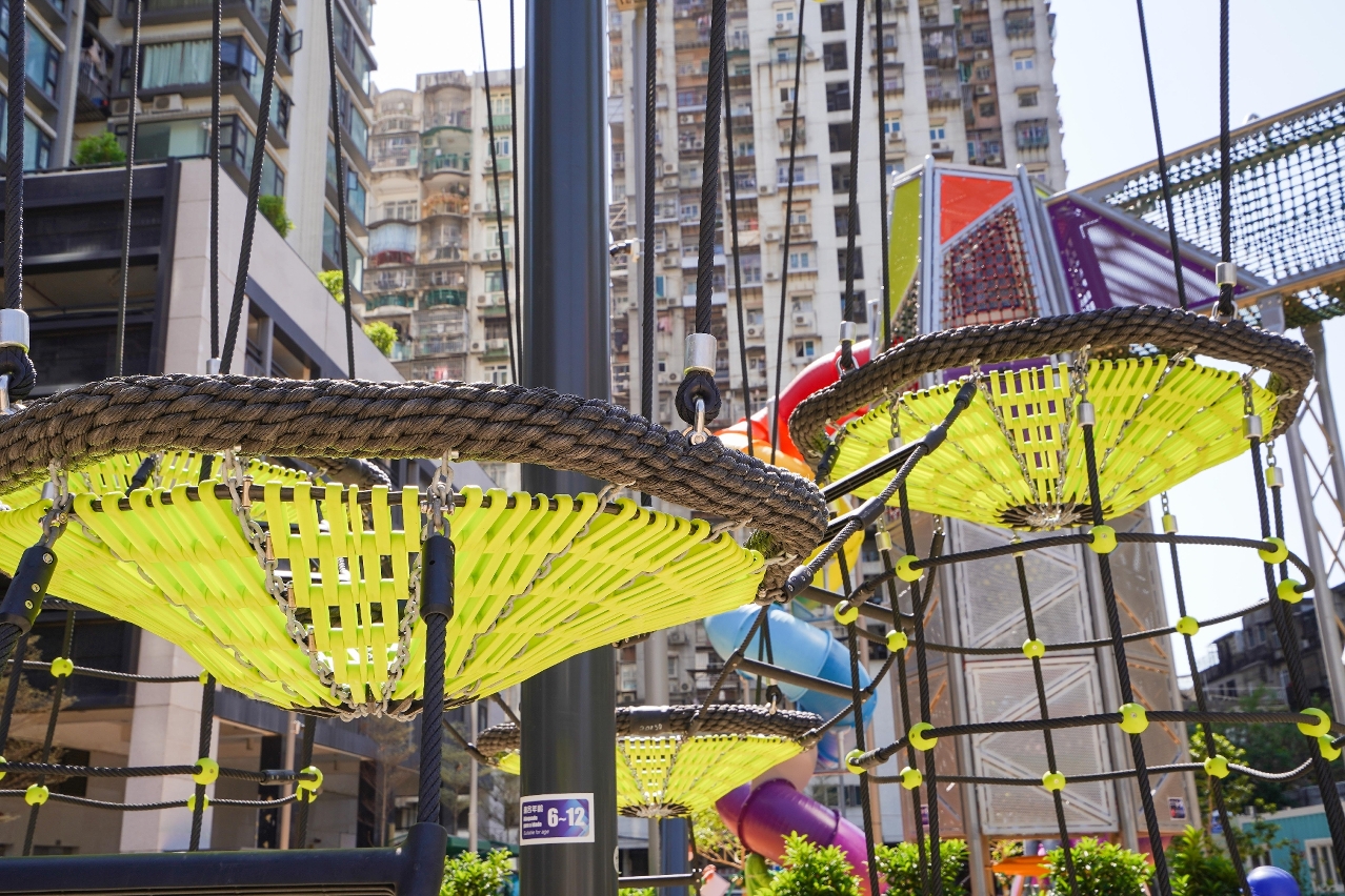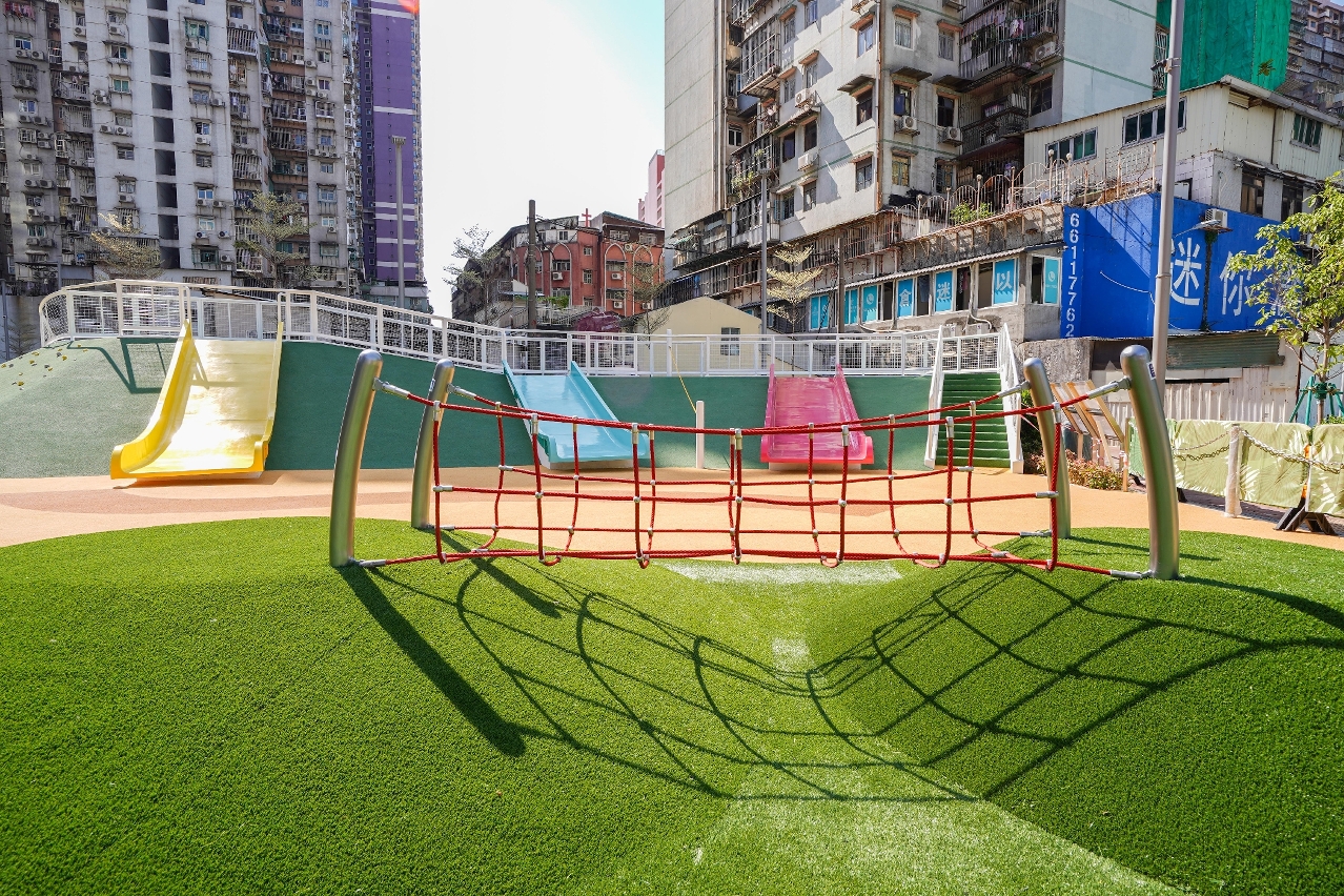 兒童遊樂場引入新穎的遊樂設施,包括澳門半島首個戶外沙池,創設與朋輩互相協助、自由遊玩的環境,讓小朋友在社區亦能享受親沙戲水樂趣,從堆沙遊戲中展現創造力。為保障幼齡兒童的使用安全,五歲或以下的幼童須在家長陪同下方能進入沙池。同時,為控制沙池人流,開放初期須預約。為保障沙池品質,除每日開放前檢查清潔外,每月亦會進行一次沙池護理,期間暫停開放。遊樂場內亦設有滑梯區、人造草山丘等親子共融遊具,劃分不同年齡區域,適合三至十二歲兒童鍛鍊身體協調性及平衡感。另一組含攀爬元素兼具適度挑戰性的高空遊樂設施,則讓大齡兒童在遊戲中學習如何安全玩樂及鍛鍊體能。市政署已安排人員在場維持秩序,冀家長和子女配合工作人員指示,注意安全。