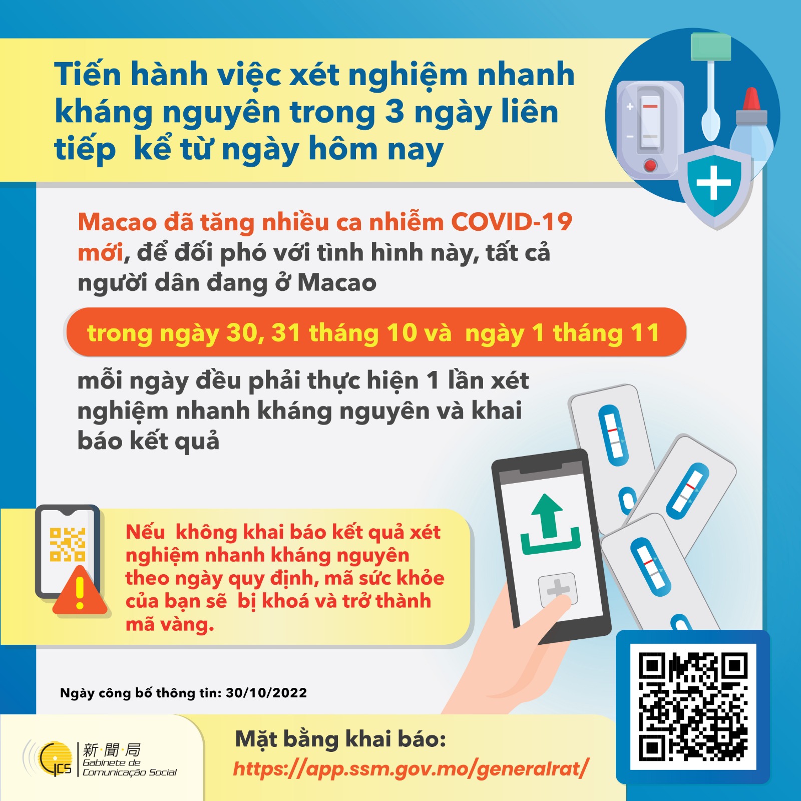 【圖文包】全部在澳人士10月30日至11月1日每天須進行1次快速抗原檢測(越南語)