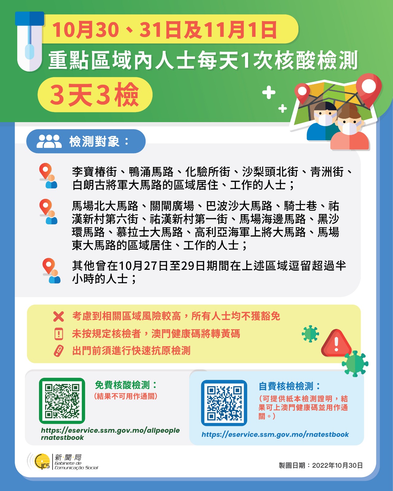 【圖文包】重點區域人士須於10月30日、31日及11月1日進行3天3檢