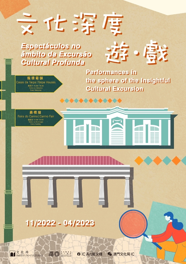 為進一步推動民間參與藝術發展和豐富本澳的文旅體驗,由文化局主辦的“文化深度遊‧戲”於2022年11月至2023年4月的周末在氹仔龍環葡韻及嘉模墟舉行,一連六個月推出多場藝文活動,首階段於11月12日至11月27日期間進行,透過戶外定點演出,將藝術及創作拉近社區的距離,為公眾帶來多元的社區藝文體驗。