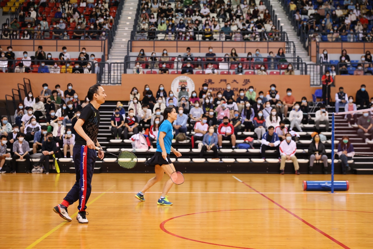 澳門大學體育事務部舉辦“世界冠軍在澳大”交流會,邀請前國家隊羽毛球運動員、澳大碩士生馬晉分享體育事業的收穫和領悟,並即席與澳大師生切磋球技,吸引超過800名澳大師生參加,交流氣氛熱烈。