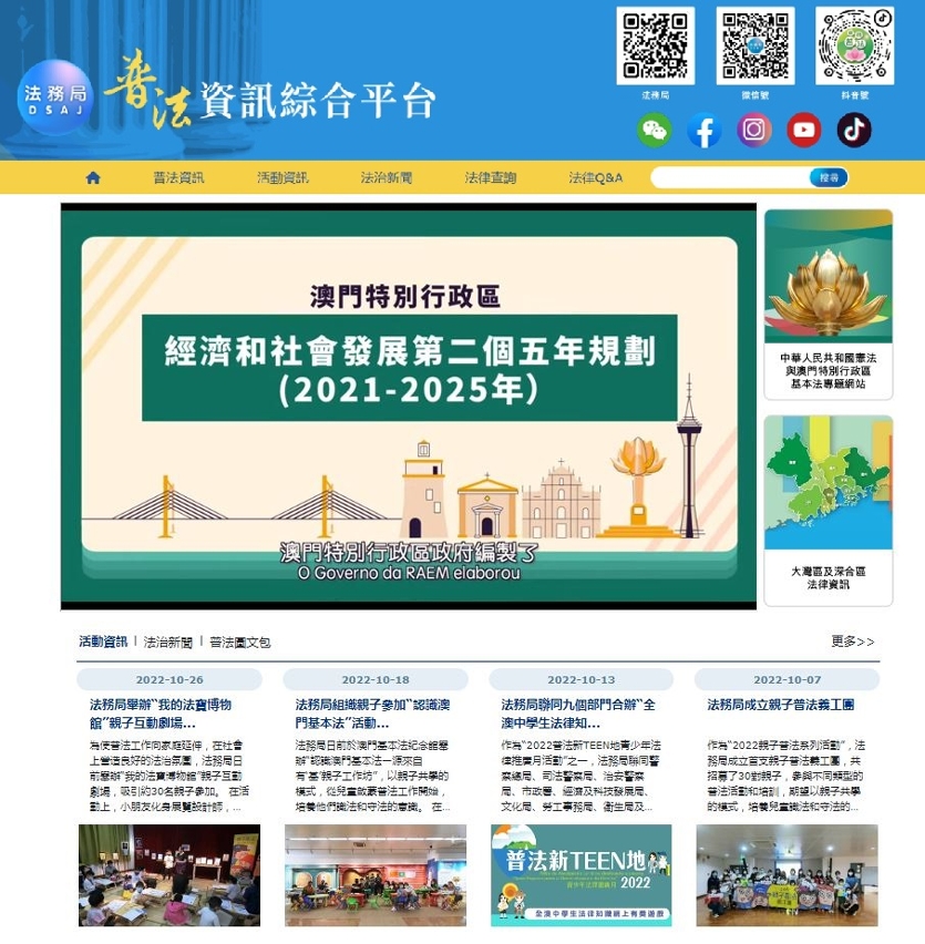 歡迎市民登入法務局“普法資訊綜合平台”(網址:https://www.dsaj.gov.mo/DsajInfo/index.aspx)或掃瞄專屬的二維碼,瀏覽和查找普法資訊。