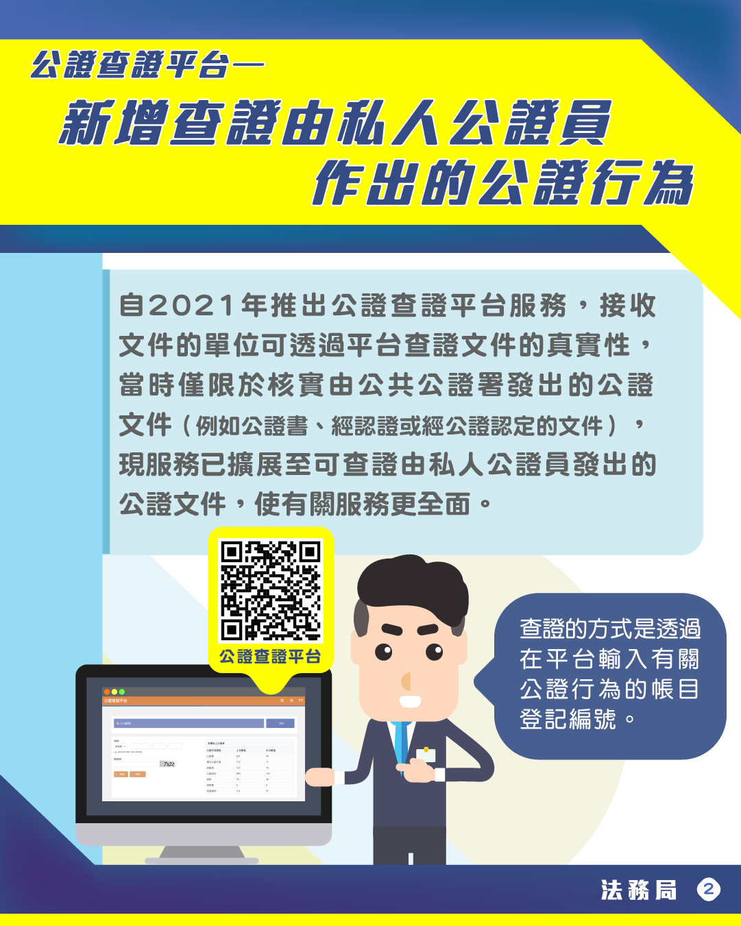 在公證行為和文書方面,公證查證平台於2021年推出時,僅能查證由公共公證署發出的公證文件的真實性,法務局於今年11月1日起將此服務延伸至私人公證員所發出的公證文件,包括公證書、經認證或經公證認定的文件等,使有關服務全面涵蓋本澳發出的所有公證文件,方便核實有關公證行為的資料,大大提高其可信性,有助促進區域融合及經濟發展。公證查證平台的網址為:https://eservice.dsaj.gov.mo/dsajservice9/document-check-web/notary/index.xhtml。
