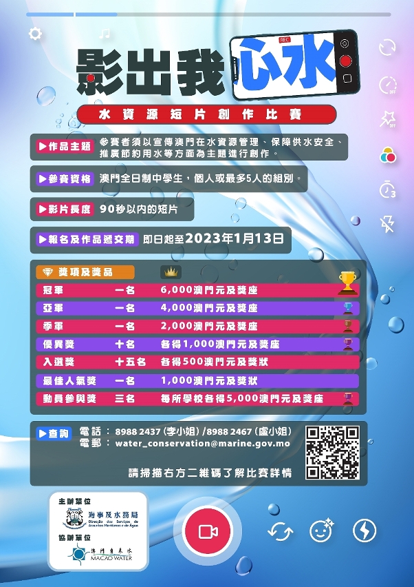 為加深澳門中學生對澳門水資源和節約用水的關注,海事及水務局舉辦《影出我心水-水資源短片創作比賽》,收件日期由明日(14日)起至2023年1月13日。