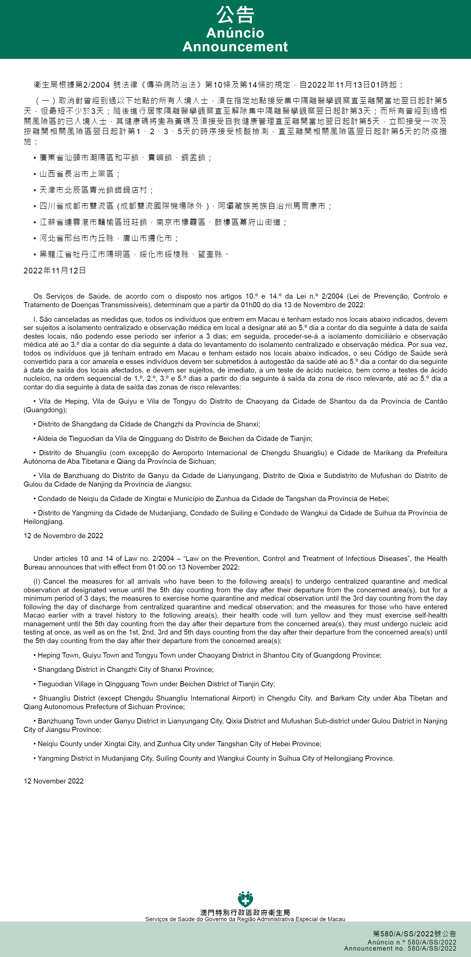 新型冠狀病毒感染應變協調中心(下稱應變協調中心)宣佈,因應內地的疫情變化,衛生局根據第2/2004號法律《傳染病防治法》第10條和第14條的規定,自2022年11月13日凌晨1時起,新增或取消對曾到內地相關區域人士的防疫措施: