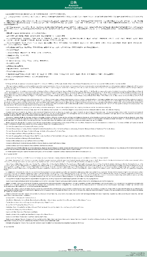 新型冠狀病毒感染應變協調中心(下稱應變協調中心)宣佈,因應內地的疫情變化,衛生局根據第2/2004號法律《傳染病防治法》第10條和第14條的規定,自2022年11月15日凌晨1時起,新增或取消對曾到內地相關區域人士的防疫措施: