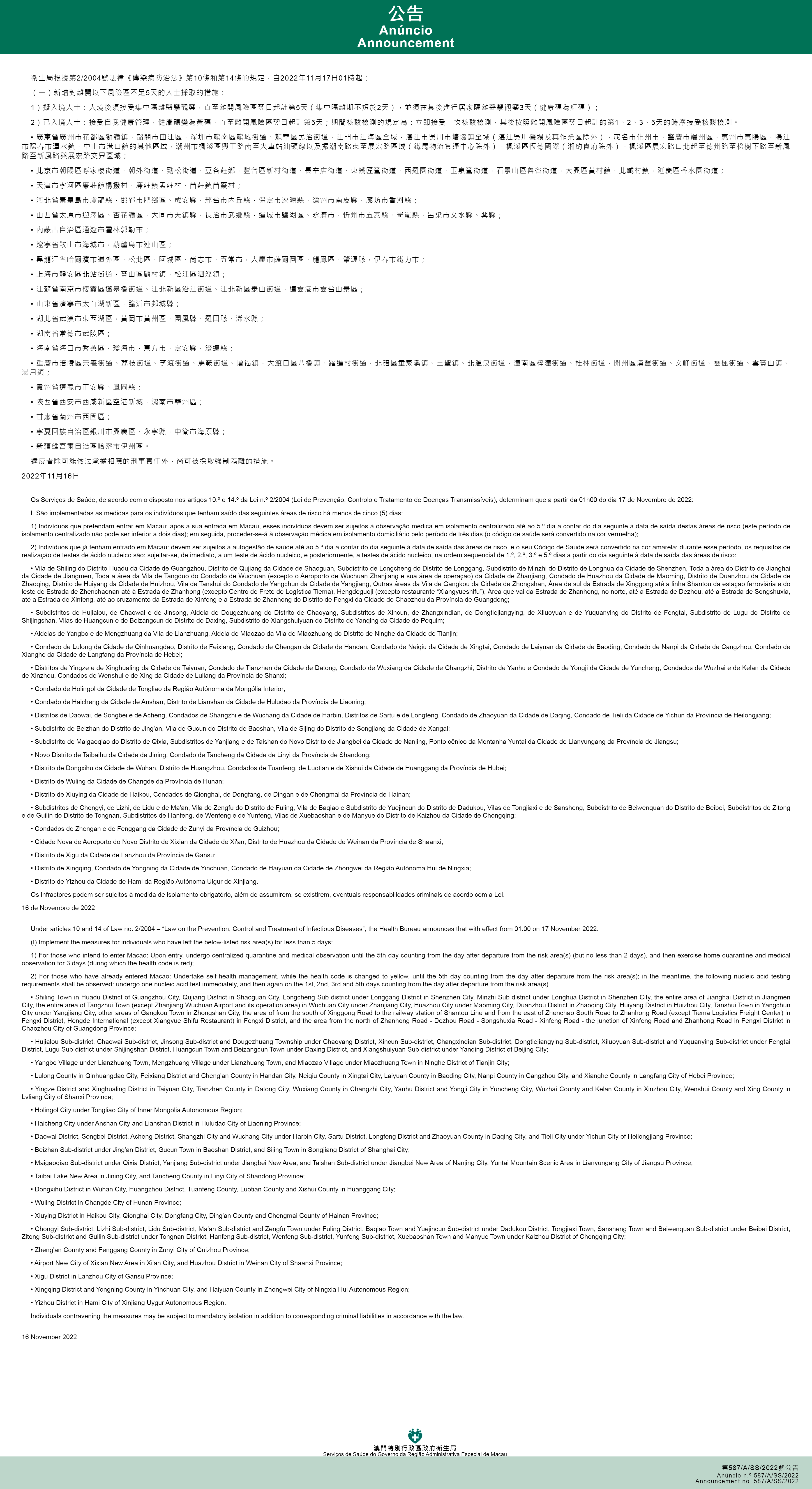 新型冠狀病毒感染應變協調中心(下稱應變協調中心)宣佈,因應內地的疫情變化,衛生局根據第2/2004號法律《傳染病防治法》第10條和第14條的規定,自2022年11月17日凌晨1時起,新增或取消對曾到內地相關區域人士的防疫措施: