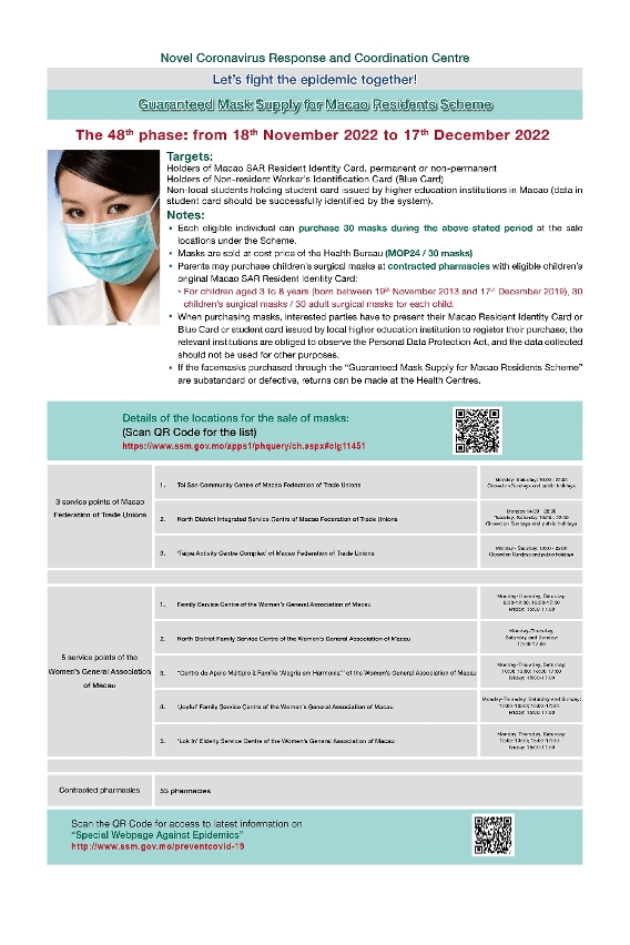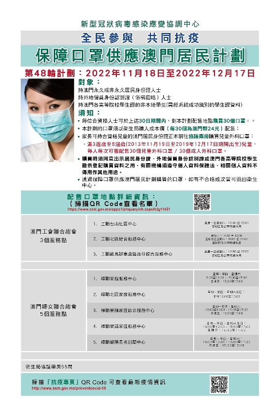 新型冠狀病毒感染應變協調中心今(17)日公佈,第48輪保障口罩供應澳門居民計劃(下稱“口罩計劃”)於明(18)日開始,配售期間為30日,即11月18日至12月17日,期間每人可一次性購買30個口罩,售價合共24澳門元。衛生局協議藥房、本澳2個社團(工聯、婦聯)繼續提供配售口罩服務,即全澳共有63個配售點,服務時間詳見附圖。透過口罩計劃購買的口罩,如有不合格或次貨可退回衛生中心。