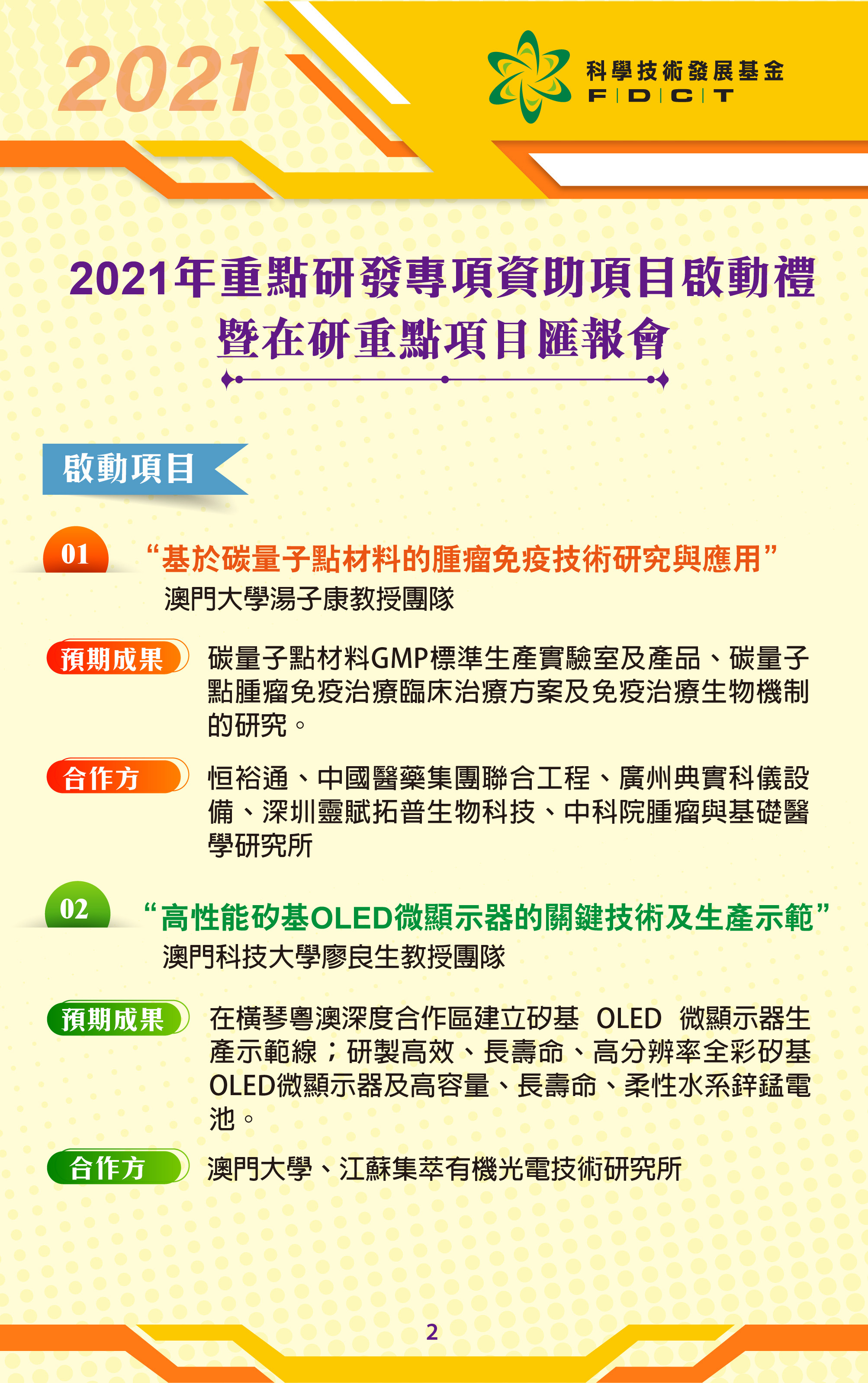 一、澳門大學湯子康教授團隊的項目-“基於碳量子點材料的腫瘤免疫技術研究與應用”,合作企業包括恒裕通有限公司、中國醫藥集團聯合工程有限公司、廣州典實科儀設備有限公司、深圳靈賦拓普生物科技有限公司、中國科學院腫瘤與基礎醫學研究所共同合作,目標是實現具有免疫啟動功能碳量子點材料的GMP標準化批量生產及生物安全性評估,建立碳量子點與患者自體腫瘤組織細胞複合的標準化工藝,確立基於碳量子點的腫瘤免疫治療方案,推進其在臨床中的應用。