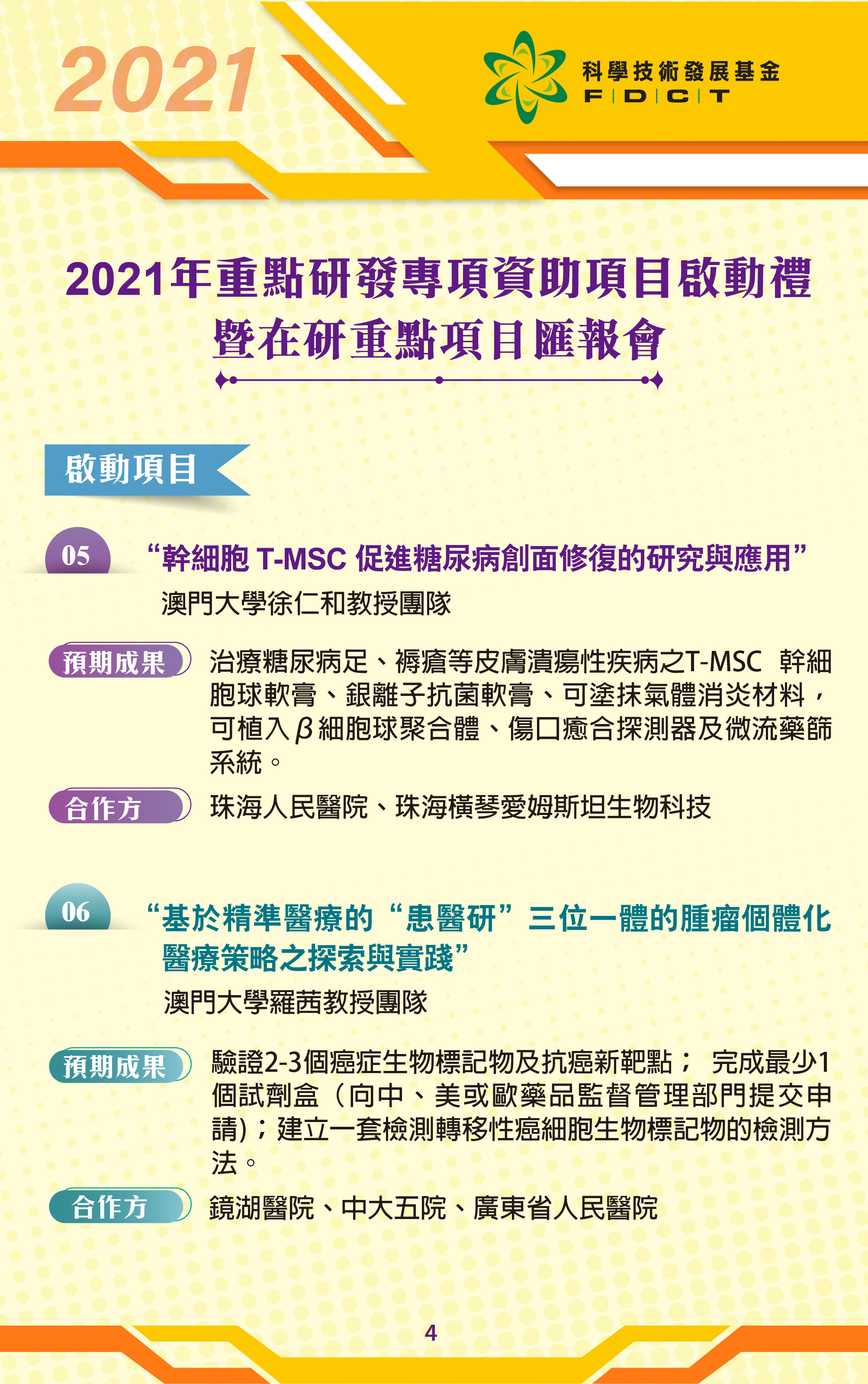 五、澳門大學徐仁和教授團隊的項目-“幹細胞 T-MSC 促進糖尿病創面修復的研究與應用”,合作方為珠海市人民醫院、珠海橫琴愛姆斯坦生物科技有限公司,目標是製作用於糖尿病足潰瘍( DFU)局部治療的T-MSC 球軟膏,促進再生來加快 DFU 的癒合。利用和開發澳門大學多種新型生物醫學技術,進一步提高 DFU 的輔助診療。