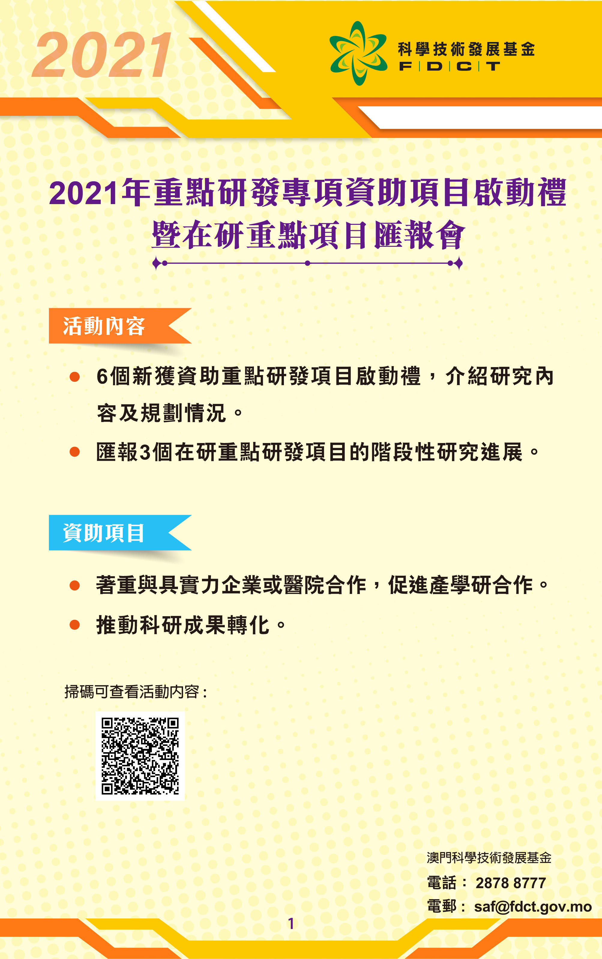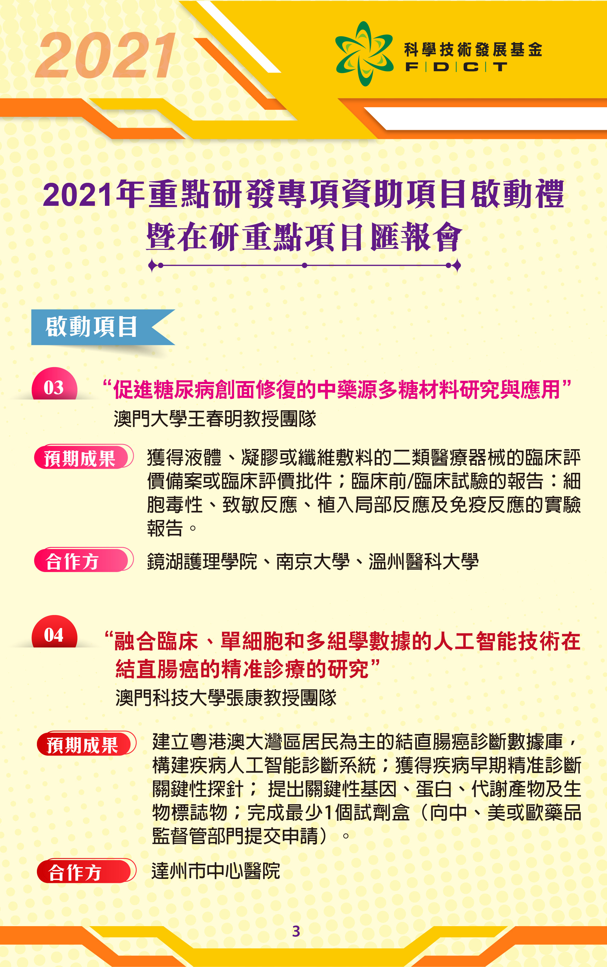 科學技術發展基金於2022年11月18日下午3時假澳門科學館會議廳舉行「2021年重點研發項目啟動禮暨在研重點項目匯報會」,匯報會內容包括介紹6個新獲資助重點研發項目的內容以及3個在研重點研發項目的階段性進展情況。